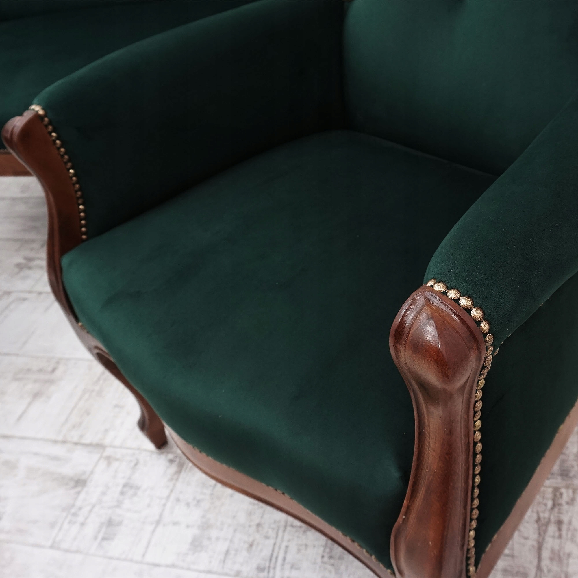 Целое сделано из дерева с красивым, натуральным цветом, который подчеркивает украшенные ручными украшениями, особенно видимые на верхних спинах спинов. Обивка в глубоком, бутылочном цвете придает мебели благородный характер, а мягкая, бархатная ткань обеспечивает большой комфорт использования. Декоративные стеганые и декоративные булавки добавляют целый утонченный стиль.