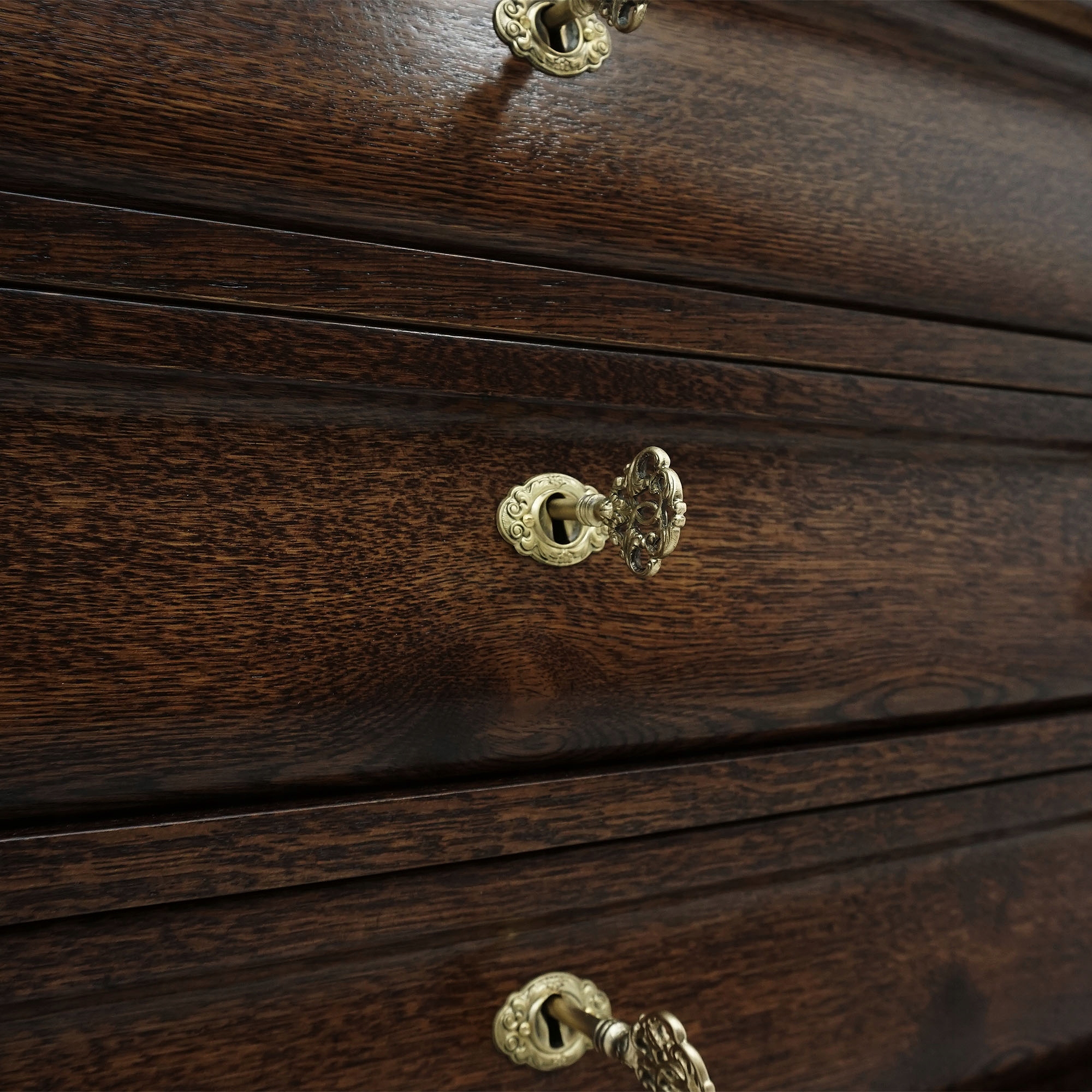 из твердого древесины, впечатляет глубоким, теплым окрашиванием и богатой резьбой - особенно впечатляющим орнаментом, венчающим центральную часть стеклянной площадки. Стеклянные полки и боковое остекление позволяют элегантно экспозиции фарфора, стекла, книг или коллекции сувениров. Нижняя часть с ящиками и закрытыми шкафами обеспечивает практическое место для хранения.