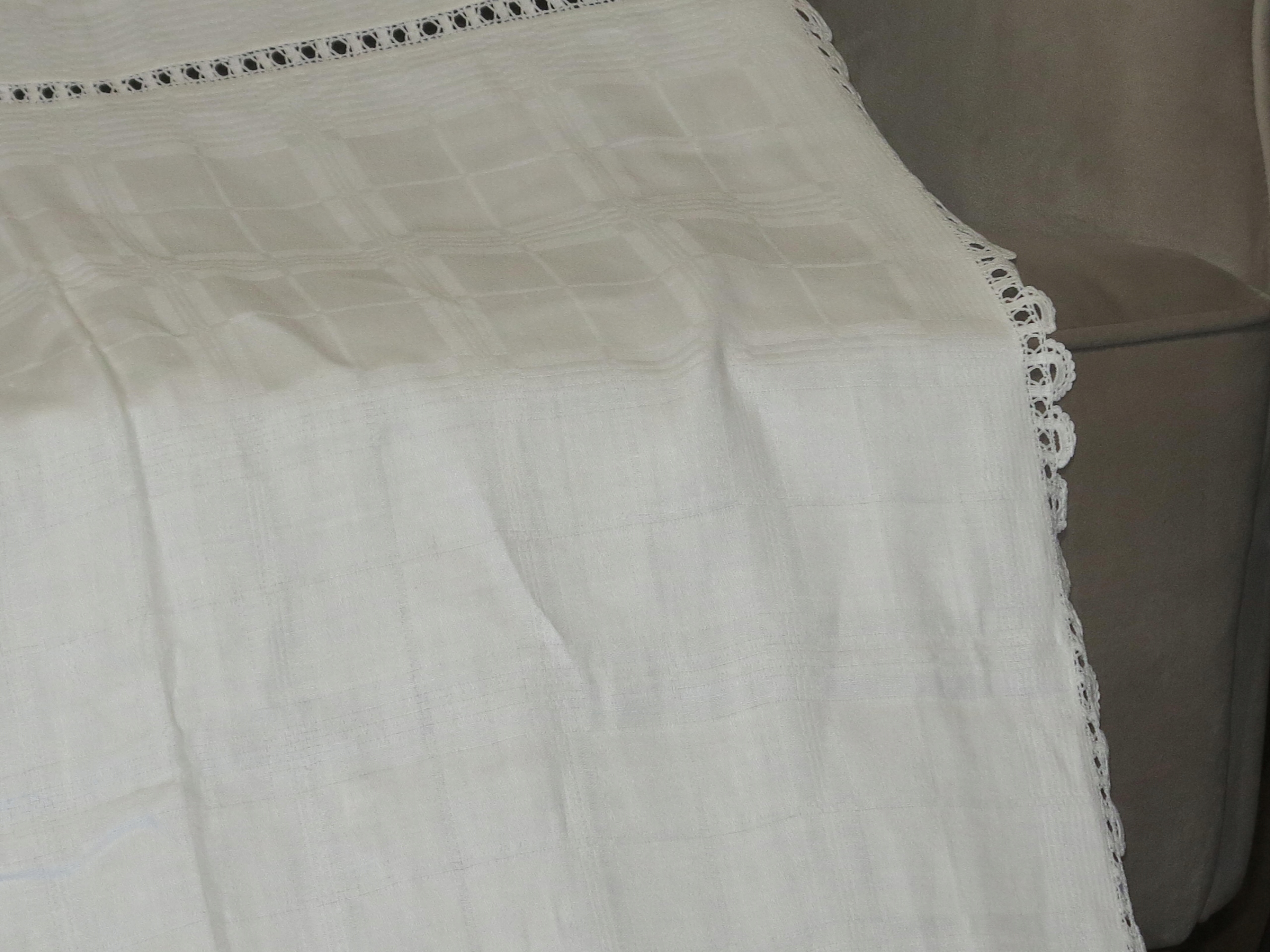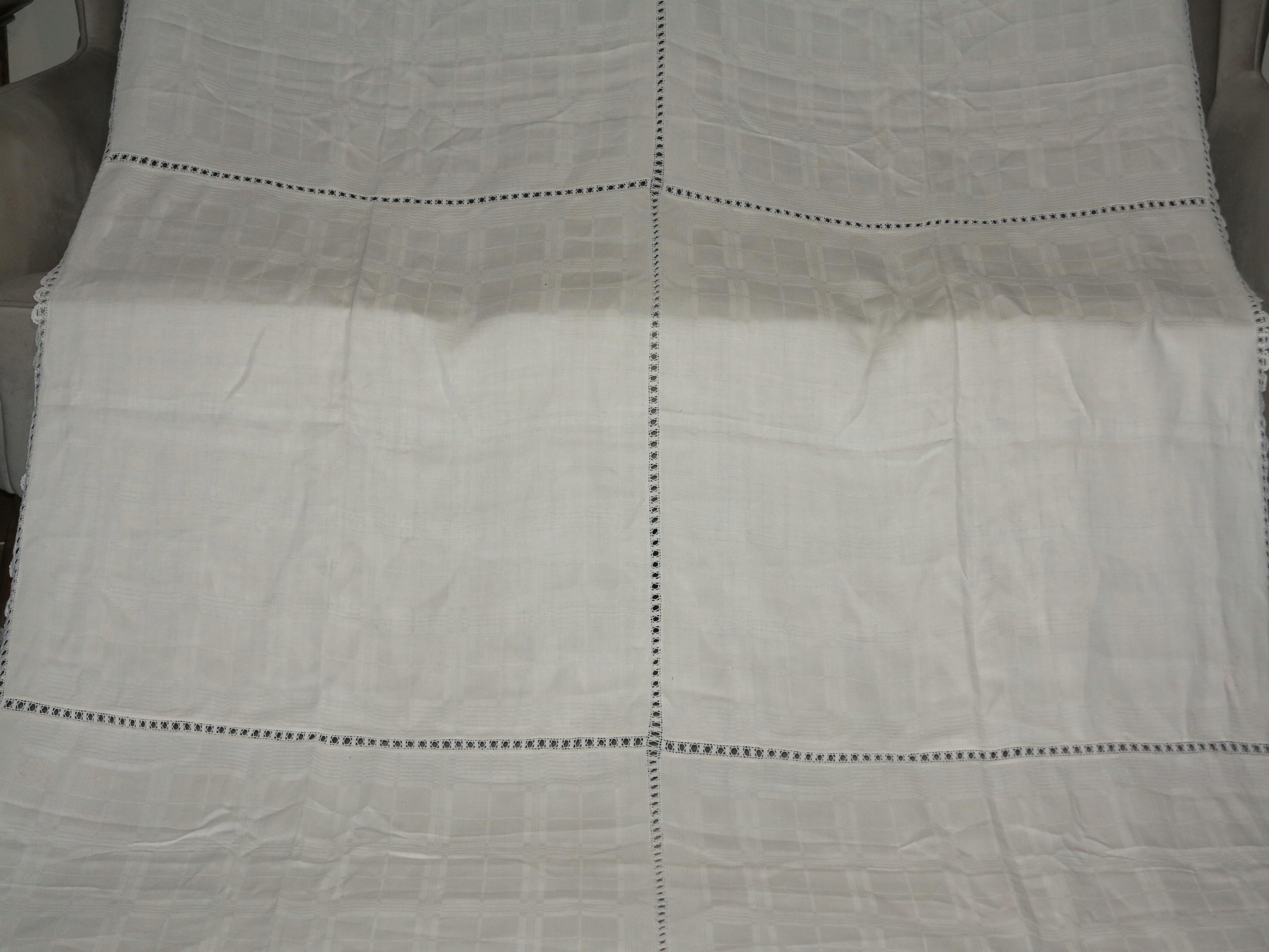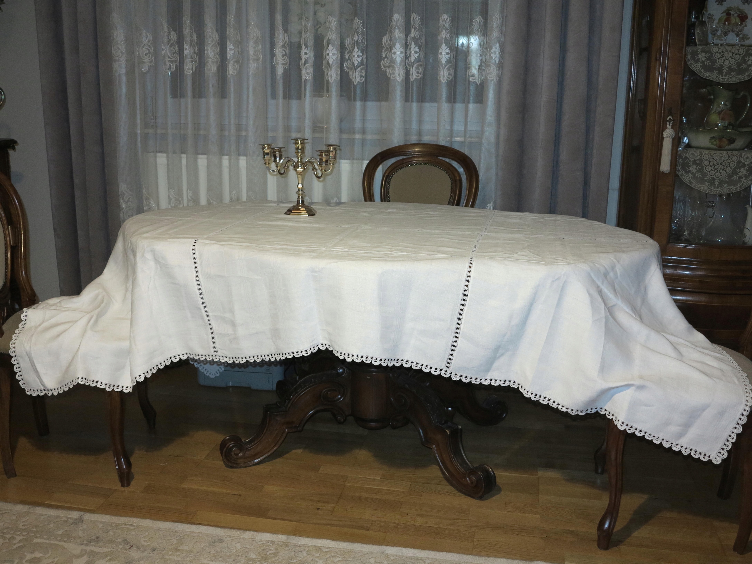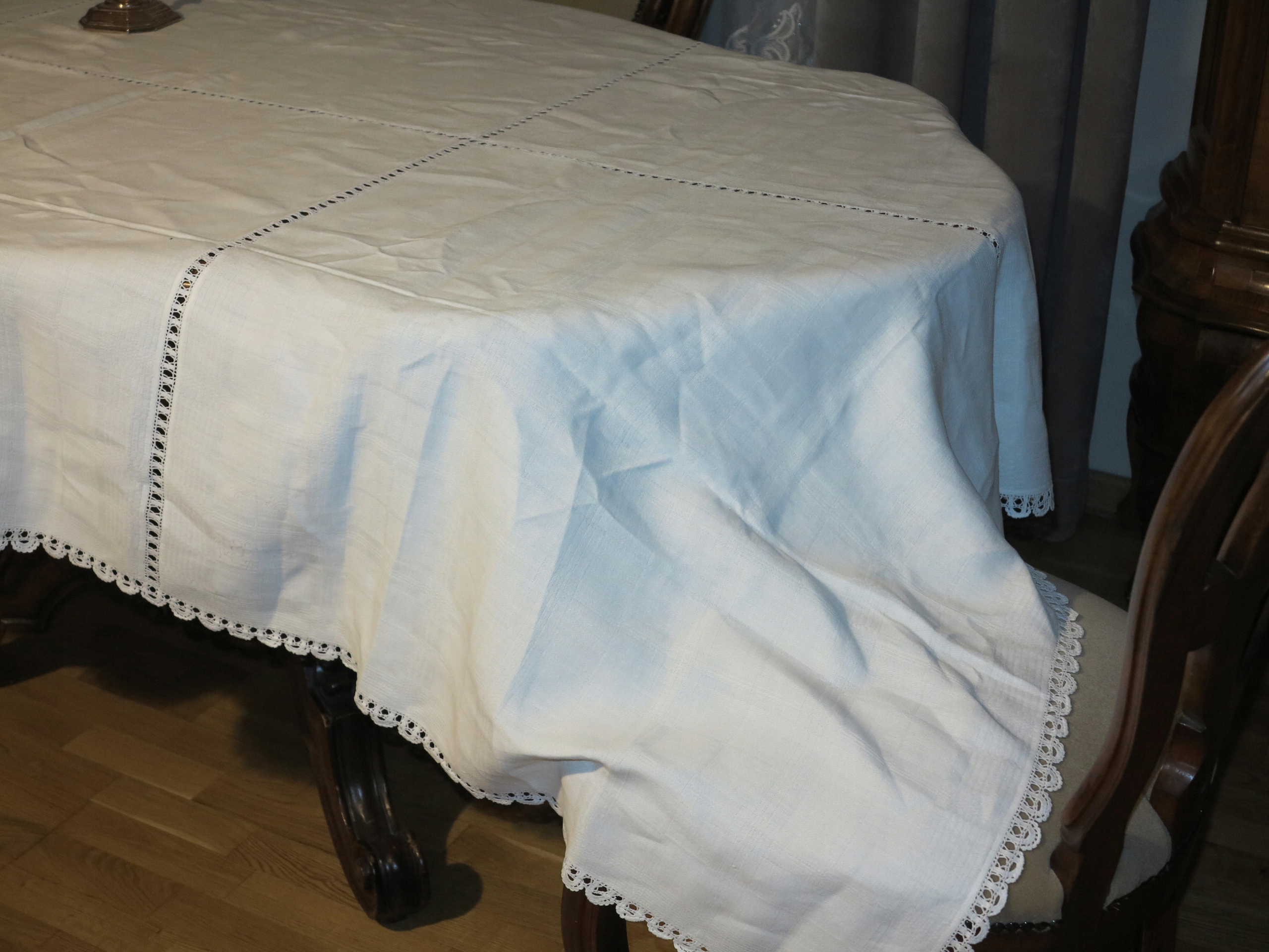 КРАСИВАЯ КЛАССИЧЕСКАЯ БЕЛАЯ СКАТЕРТЬ ИЗ ЛЬНА, Слегка струящийся дамаск, УКРАШЕННАЯ ШНУРАМИ РУЧНОЙ РАБОТЫ. ПОКРЫТА КОРОННЫМ КРУЖЕВОМ ВОКРУГ