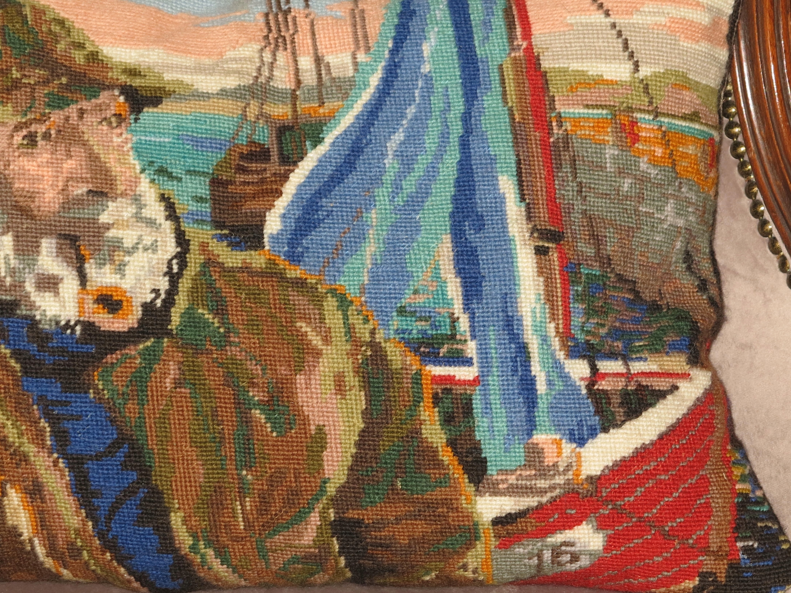 АНТИКВАРИАТ - ЧУДЕСНАЯ ПОДУШКА, ИНТЕНСИВНАЯ РУЧНАЯ ВЫШИВКА, КРЕСТ - СТАРЫЙ РЫБАК НА ЛОДКЕ