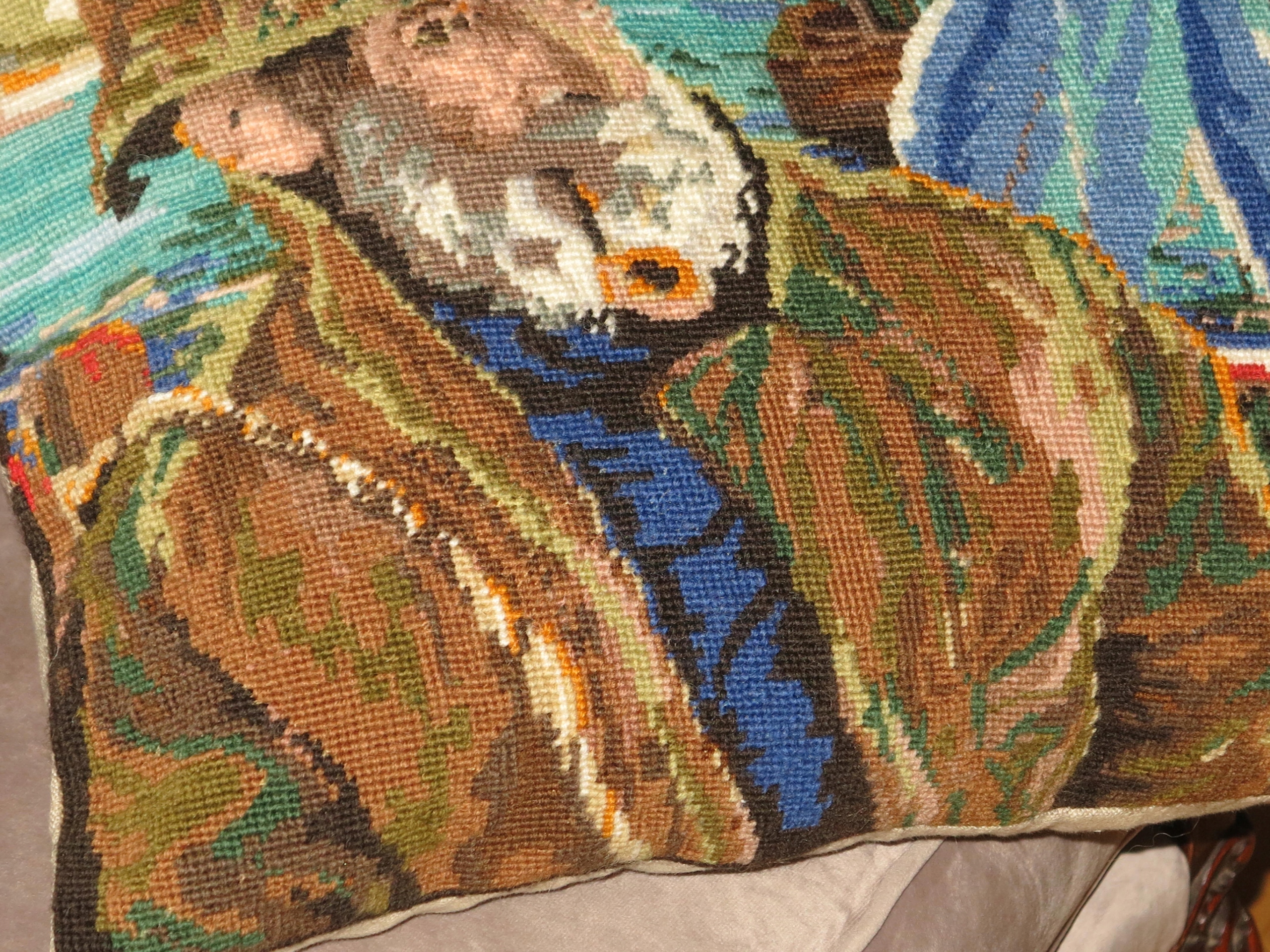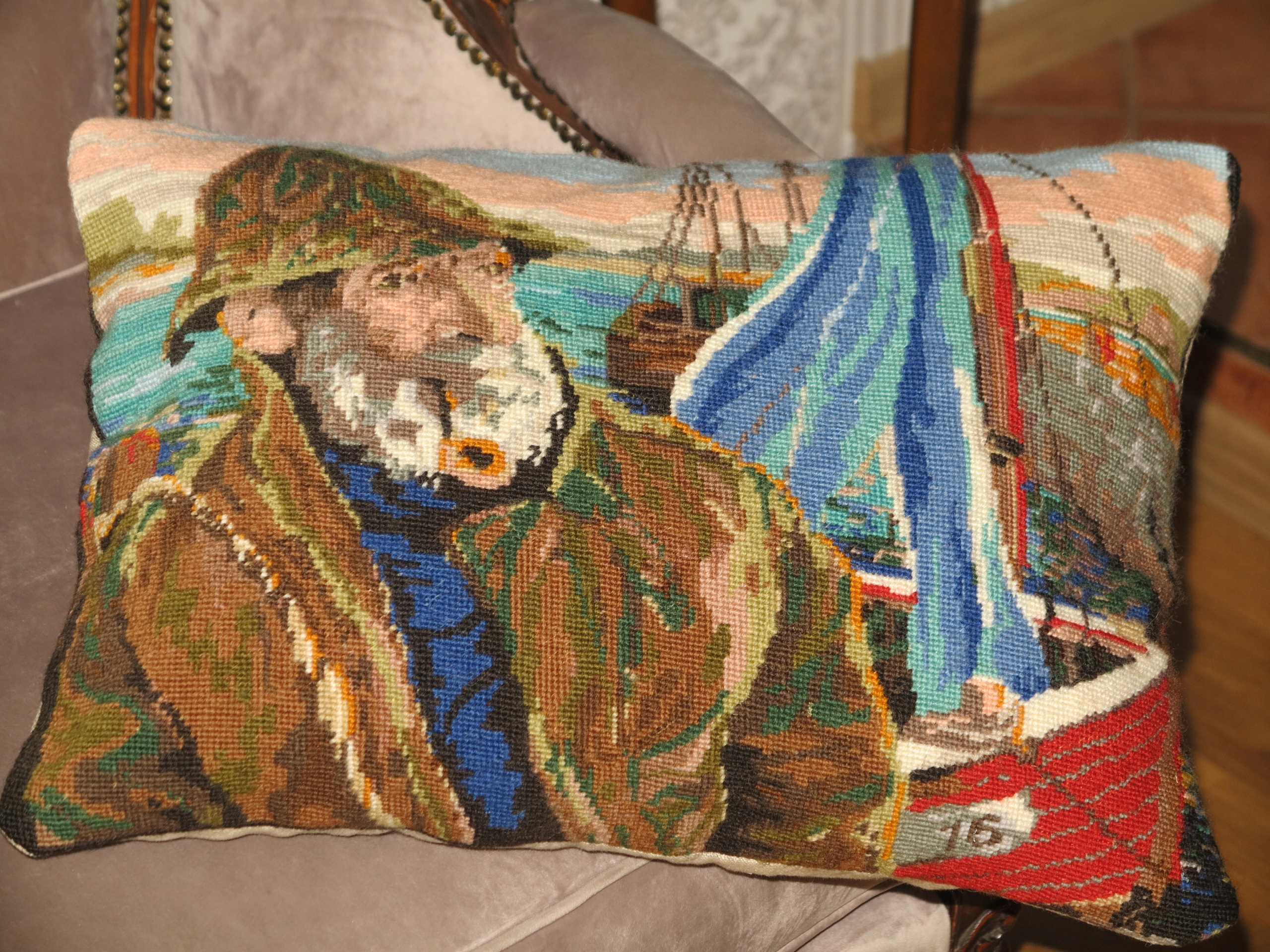 ИСКЛЮЧИТЕЛЬНО КРАСИВАЯ И ОЧЕНЬ ДЕКОРАТИВНАЯ БОЛЬШАЯ АНТИКВАРНАЯ ПОДУШКА С НАПОЛНЕНИЕМ ПЕРЕДНЯЯ ПЕРЕДНЯЯ С РУЧНОЙ РАБОТЫ, ОЧЕНЬ ИНТЕНСИВНАЯ ВЫШИВКА КРЕСТОМ - СТАРЫЙ РЫБАК НА ЛОДКЕ. СПИНКА ИЗ ЛЬНЯНОГО ХОЛСТА