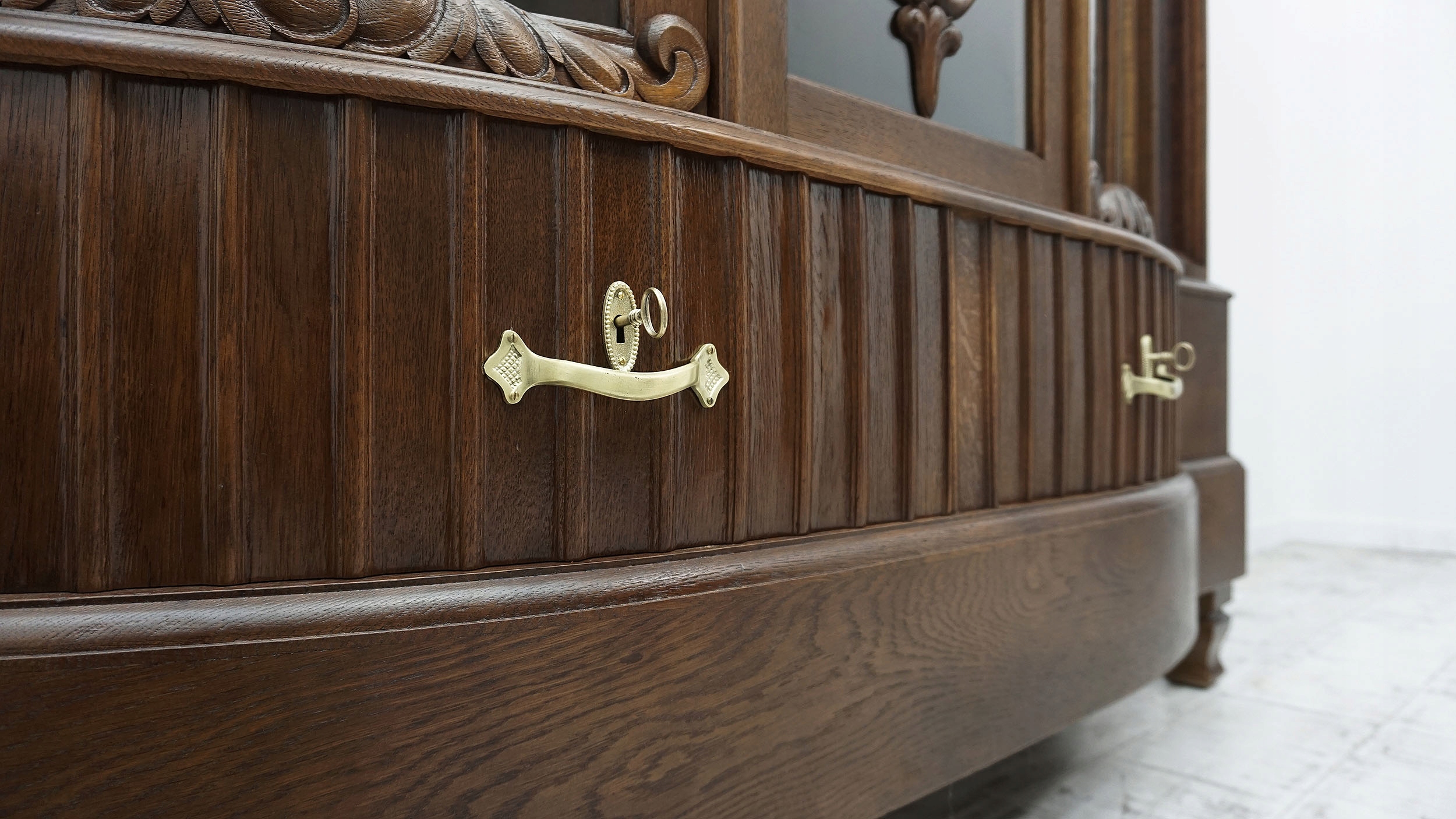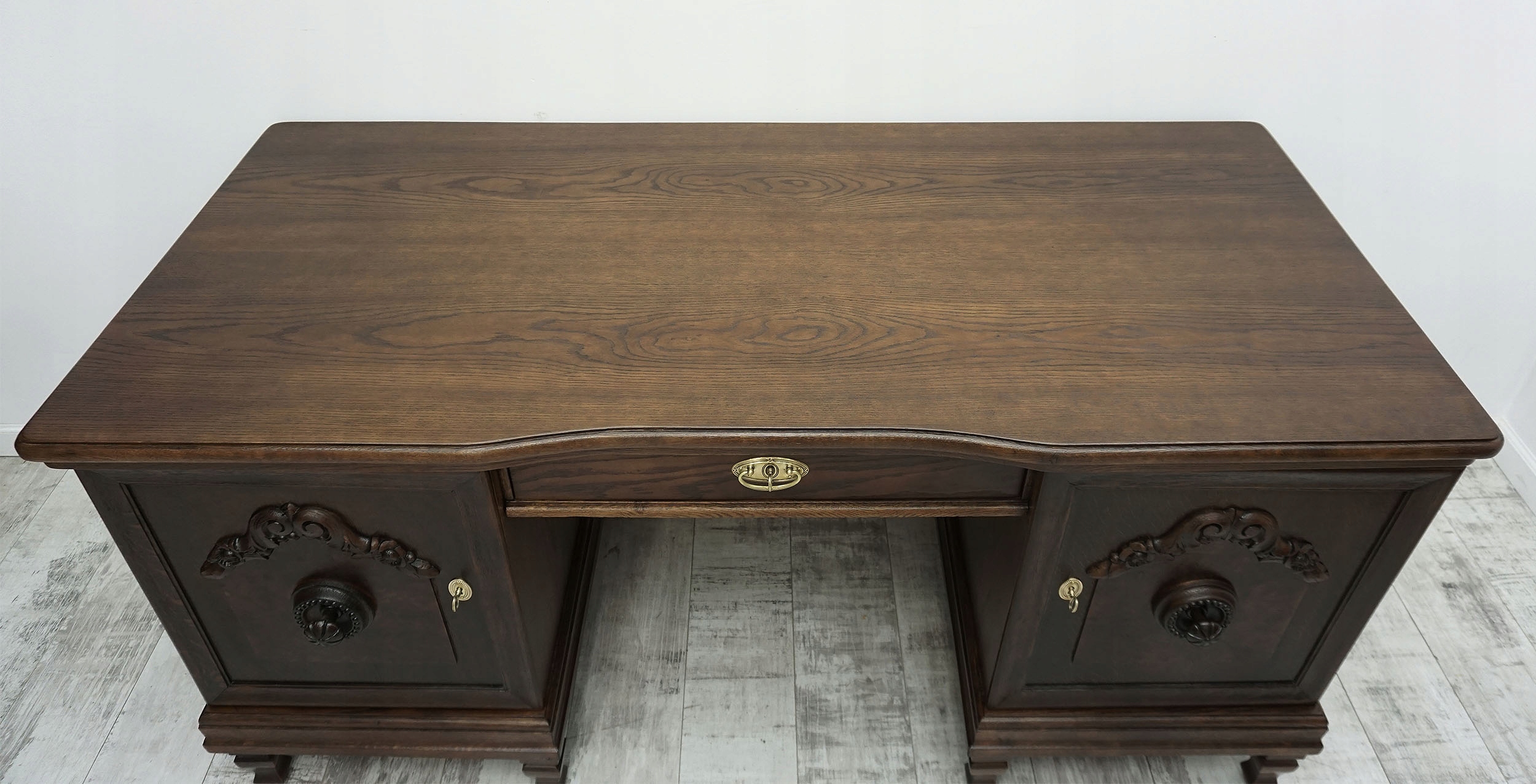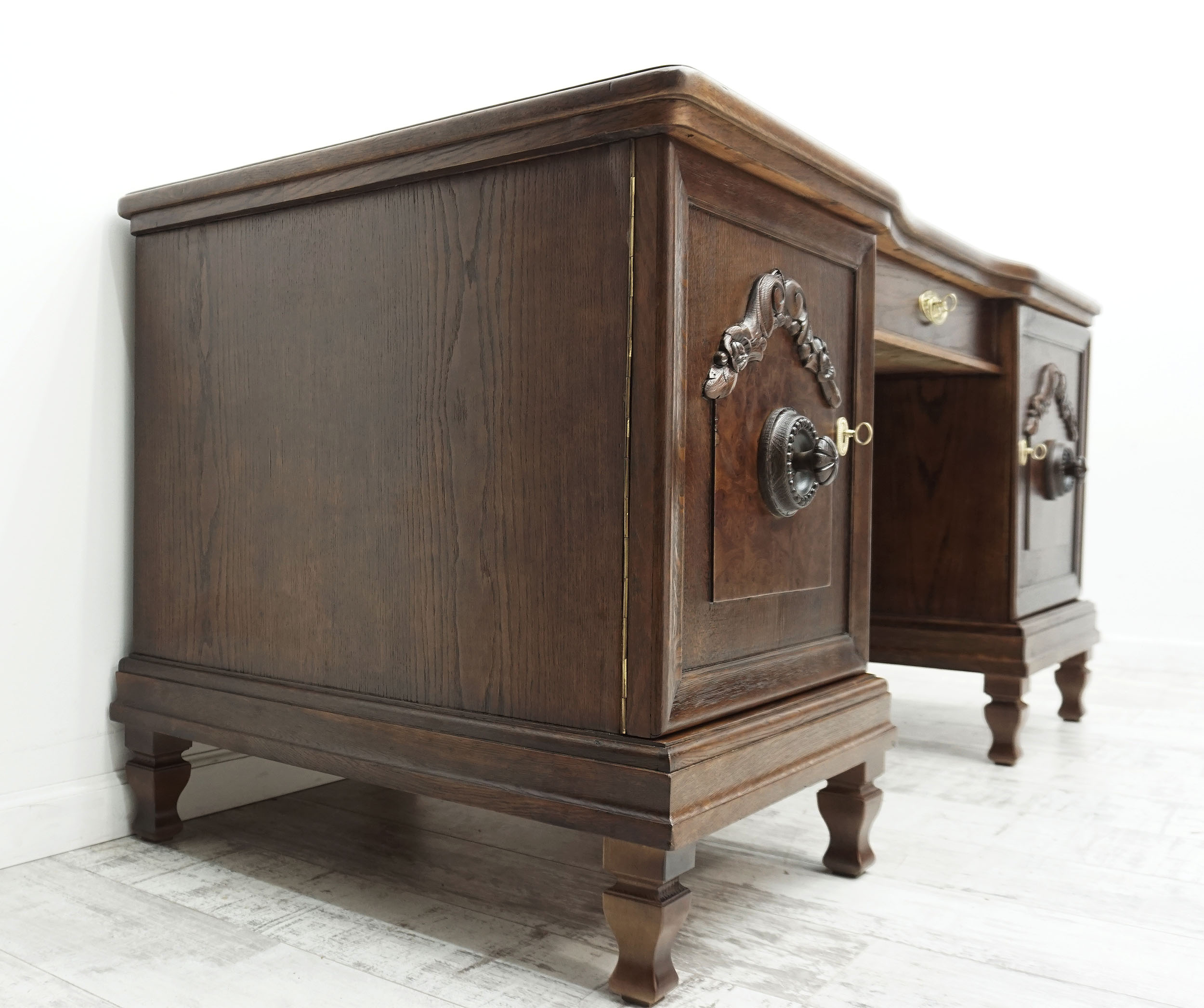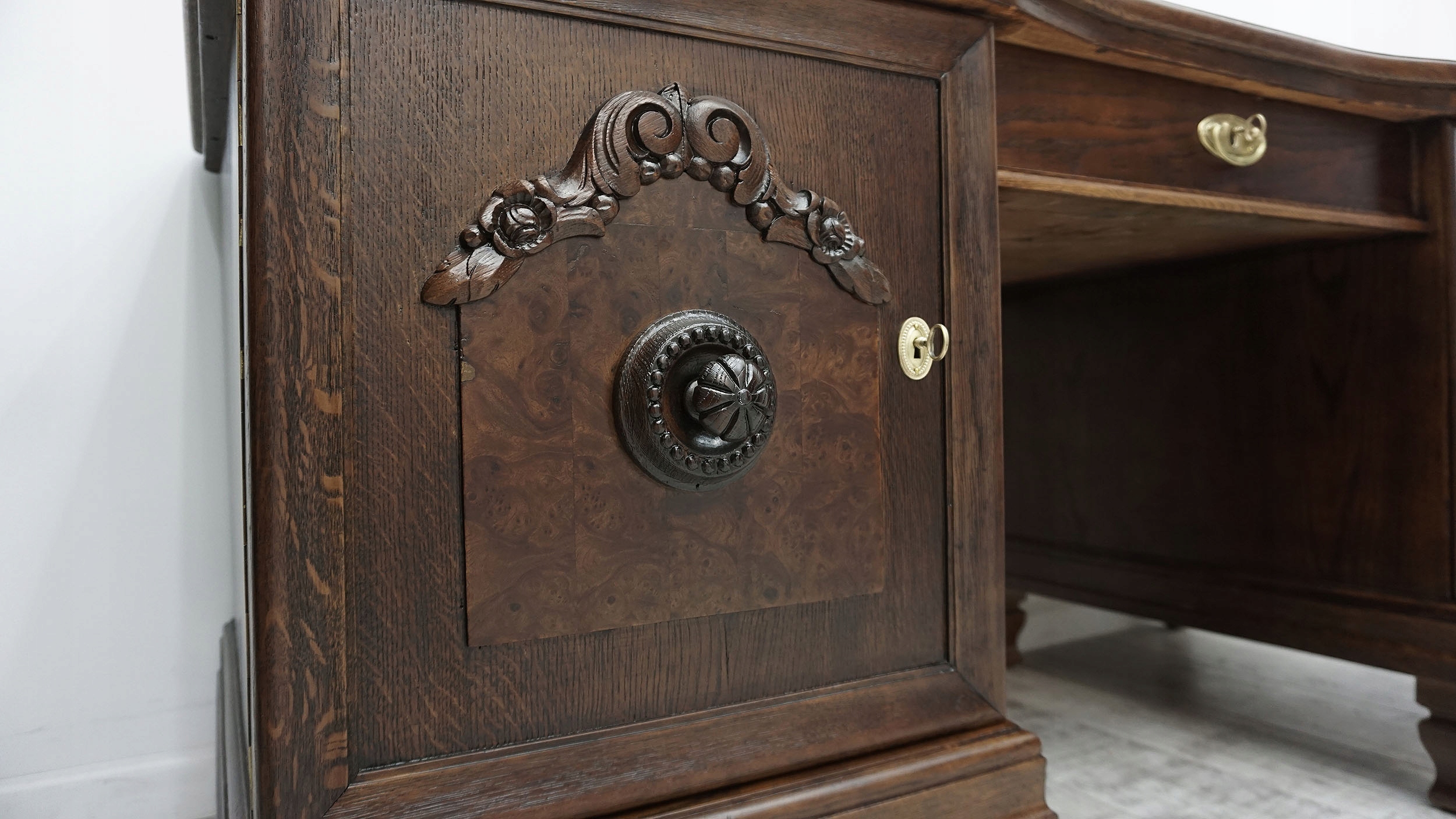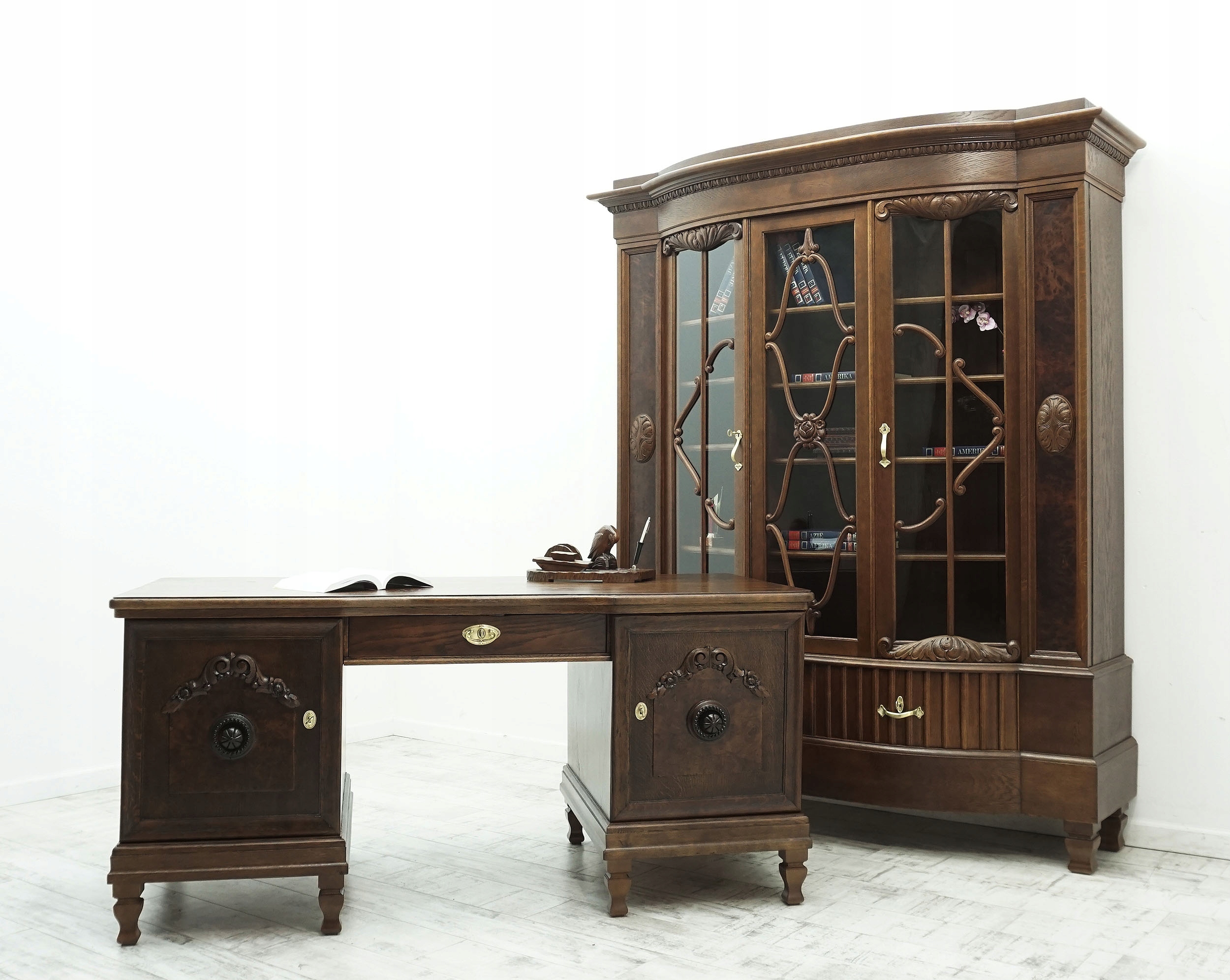 Представляем кабинет в межвоенном стиле начала 20 века. Этот комплект родом из Германии и был изготовлен из дуба и ореха. Мебель была капитально отремонтирована, поэтому находится в отличном визуальном и техническом состоянии. Цвета мебели подчеркивают красивую текстуру дерева и детали скульптур.