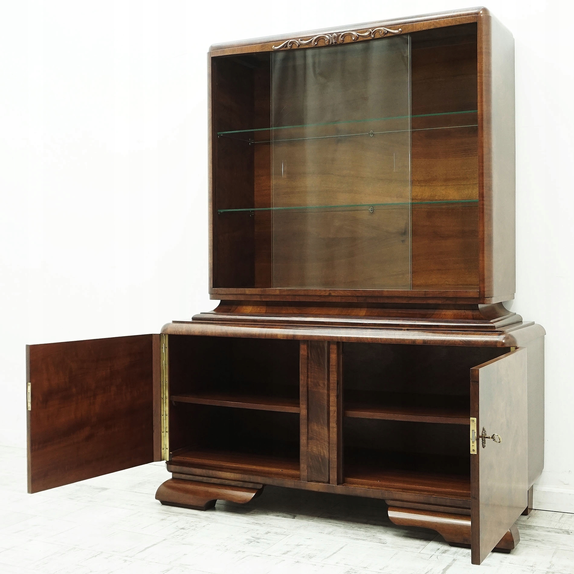 Окно в стиле ар-деко, с гордостью представляя обновленную форму, излучает роскошь и изысканность, типичные для 1920-х и 1930-х годов. Изготовленная из ореховой древесины высочайшего качества, мебель восхищает элегантностью и богатством натуральных тонов. Передняя часть витрины украшена геометрическим расположением панелей из орехового дерева, создающих неповторимый узор, характеризующий стиль ар-деко. Эта витрина – не только функциональный элемент, но и уникальное произведение искусства, восхищающее своей историей и элегантностью.