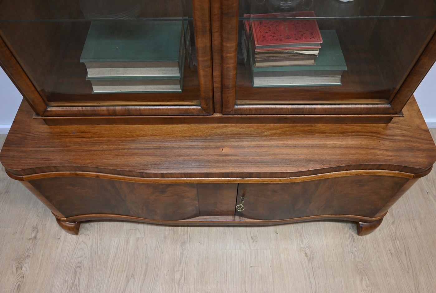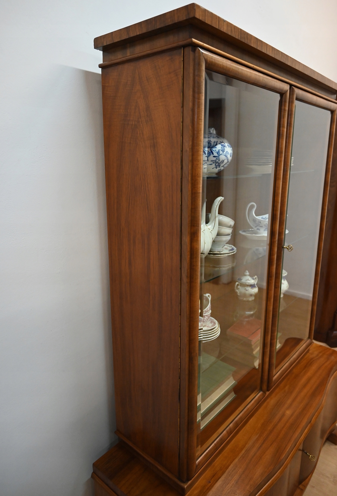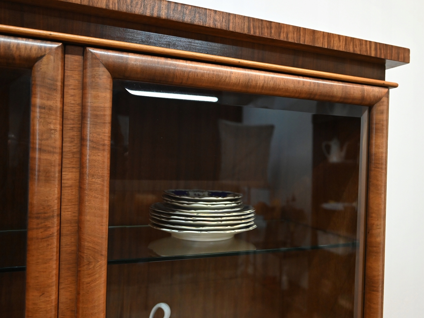 Очень хорошее состояние. Мебель готова к использованию. Обновились внешние поверхности и интерьер мебели. Мебель уже старая и следы прошлого, не влияющие на ее эстетическое восприятие, являются доказательством подлинности мебели. Витрину можно разместить сразу в квартире.