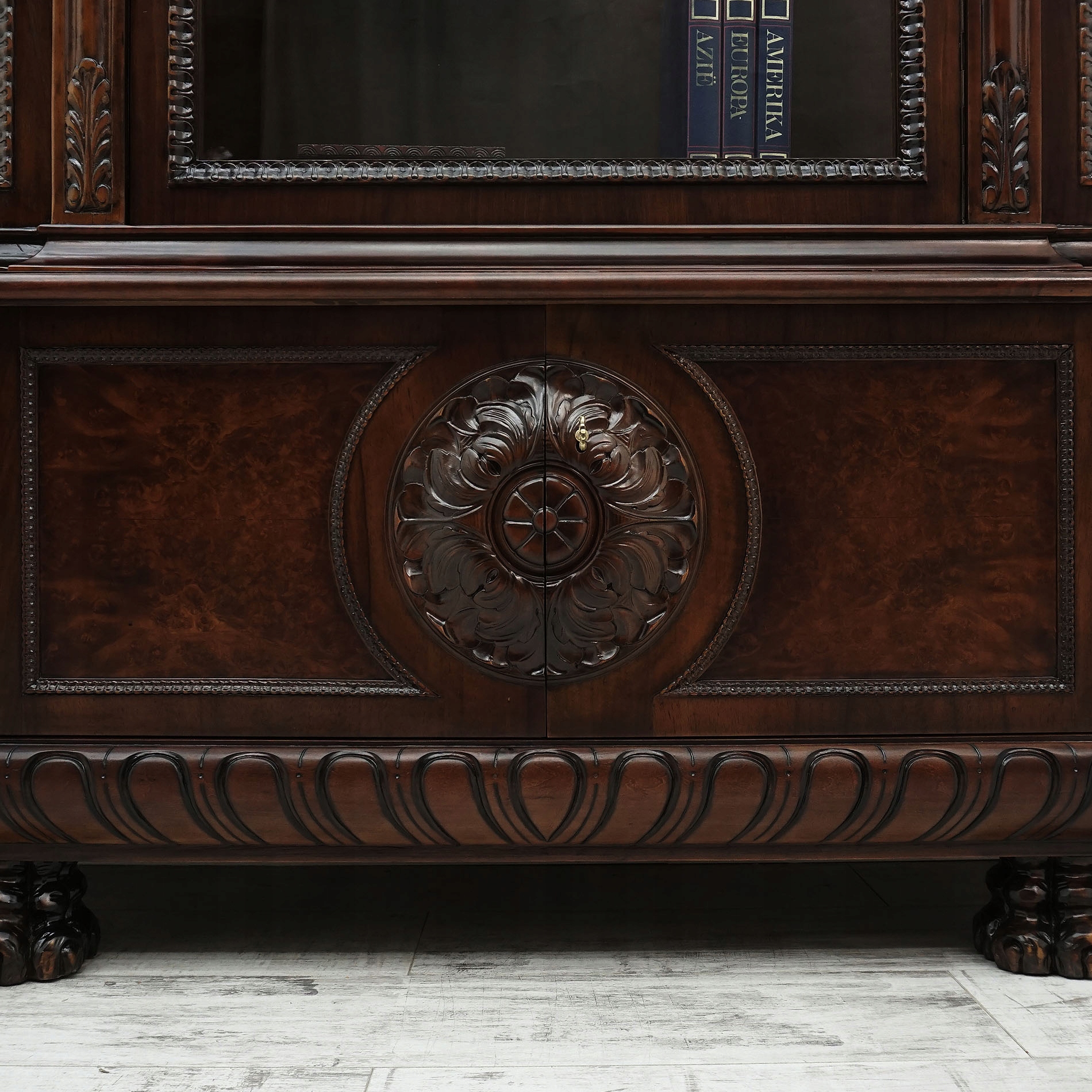 Эта уникальная витрина сочетает в себе мастерство изготовления с изысканным декором, который привлечет внимание каждого любителя антиквариата. Богатые детали, вырезанные на деревянной поверхности, тонкие закругления и изящные орнаменты придают ей неповторимый характер, который прекрасно впишется как в элегантный интерьер, так и в классическую композицию.