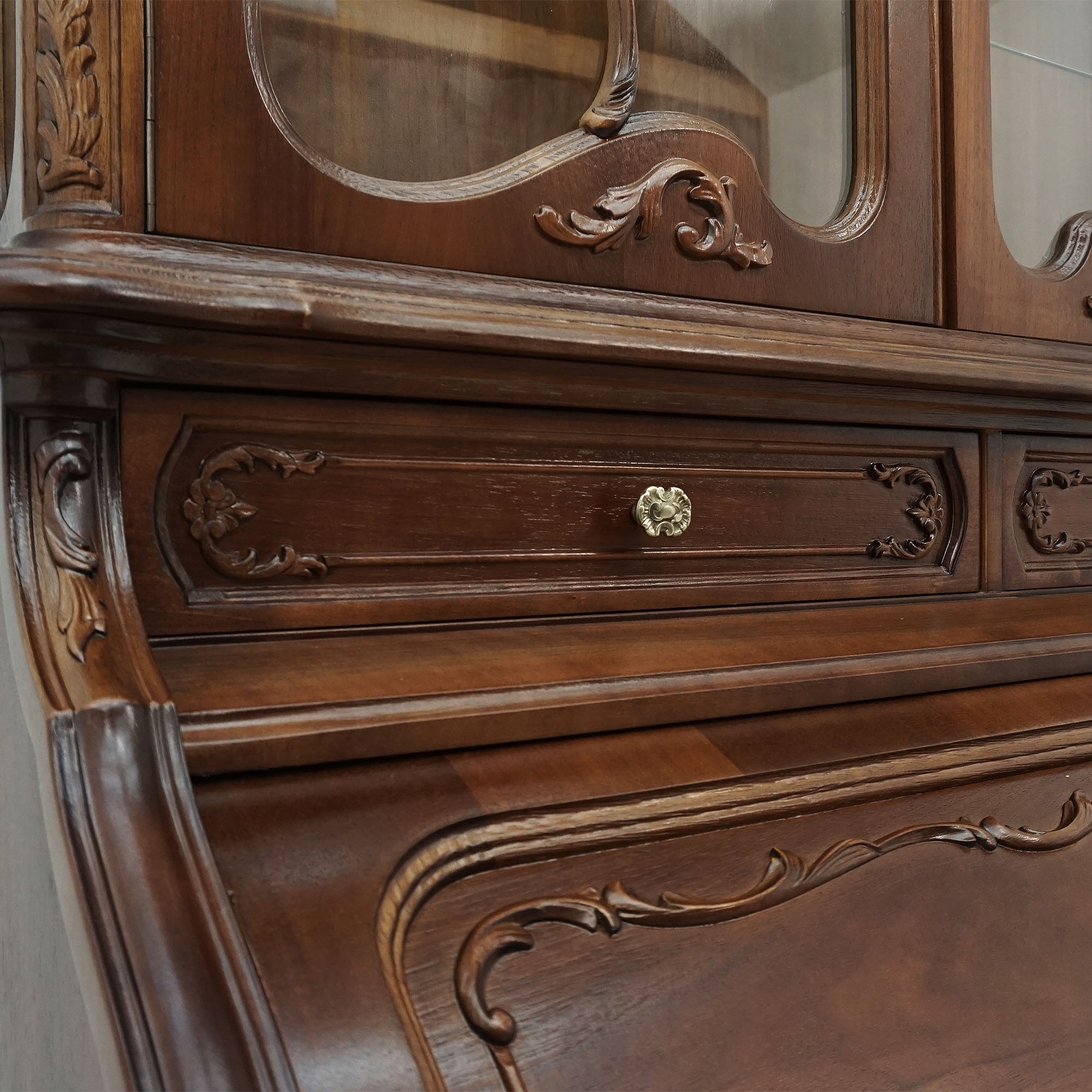 В верхней части имеется стеклянная дверца с декоративными стойками, идеально подходящая для демонстрации фарфора, стекла или ваших любимых безделушек. Центральная часть с выдвижным зеленым письменным столом создает стильное и функциональное пространство для переписки, работы или ежедневных заметок. Многочисленные небольшие ящики и отделения помогают поддерживать порядок, добавляя мебели практичности.