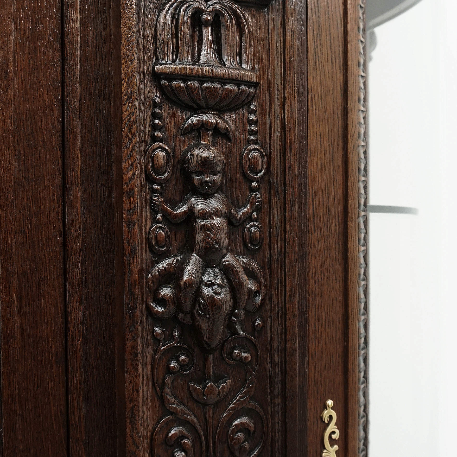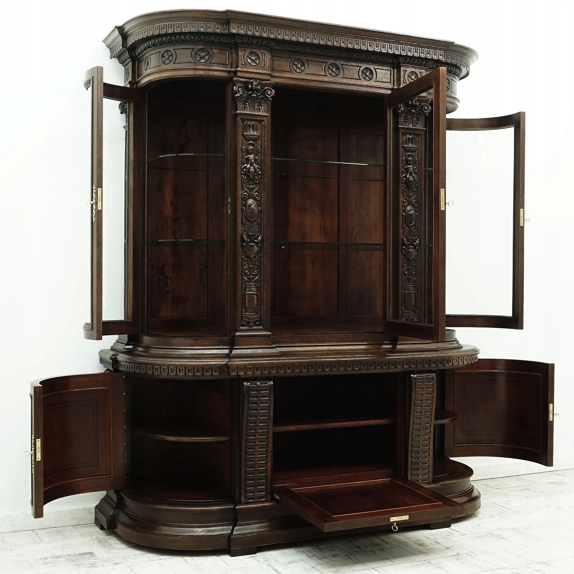 Эта жемчужина мебели, глубоко укорененная в традициях дизайна эпохи Возрождения, выделяется своей впечатляющей формой. Его фасад украшен замысловатыми резными деталями, которые являются настоящей данью мастерству ремесленников эпохи Возрождения. Растительные, животные и геометрические мотивы гармонично сочетаются друг с другом, создавая необычные композиции. Витрина имеет массивные, выпуклые фасады, украшенные изящными рельефами и сложными ручками, которые придают им элегантный характер и разнообразят внешний вид. Тонкие линии и пропорции подчеркивают его классический и неподвластный времени шарм, в то же время вписываясь в современный интерьер. Шкаф-витрина – это не только функциональный предмет мебели, но и настоящее произведение искусства, которое придает интерьеру неповторимый шарм и характер, одновременно являясь сувениром. золотая эра мастерства и дизайна