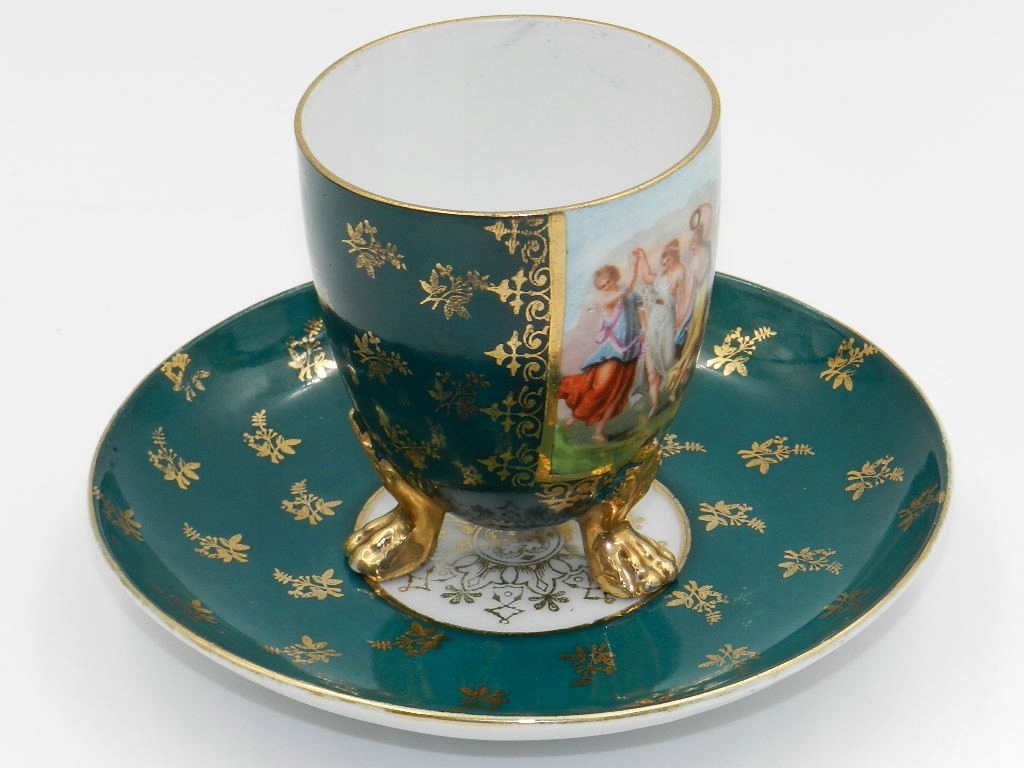 Необычная форма экспоната в сочетании с массивными позолоченными ножками чашки и чрезвычайно художественной формой ручки придают всему экспонату невероятный и элегантный вид.