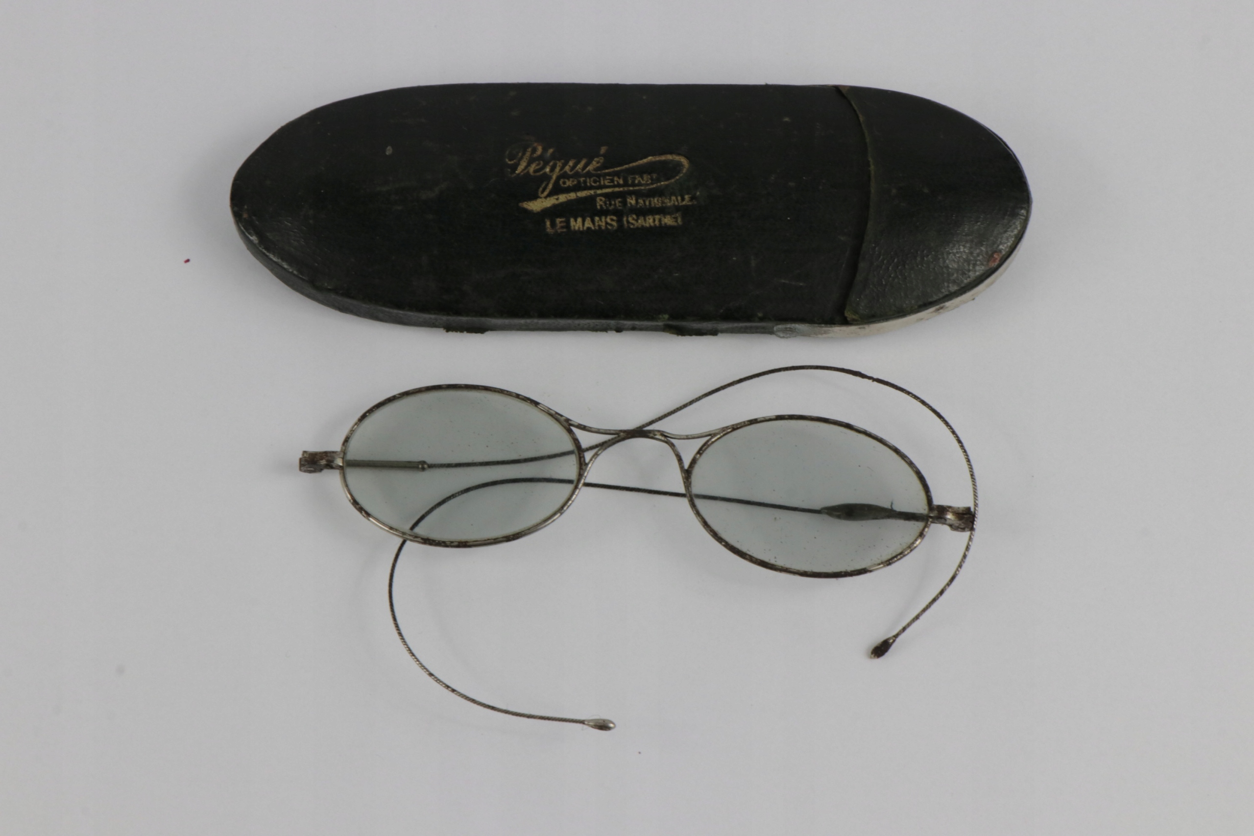 Очень интересные старинные очки примерно 1900-1930 годов в оригинальном футляре. Надпись Pegue Opticien Fab Rue Nationale Le Mans (Sarthe) на еюи.Слегка тонированное стекло. Стальные рамы. Совсем маленькие очки, возможно, детские.