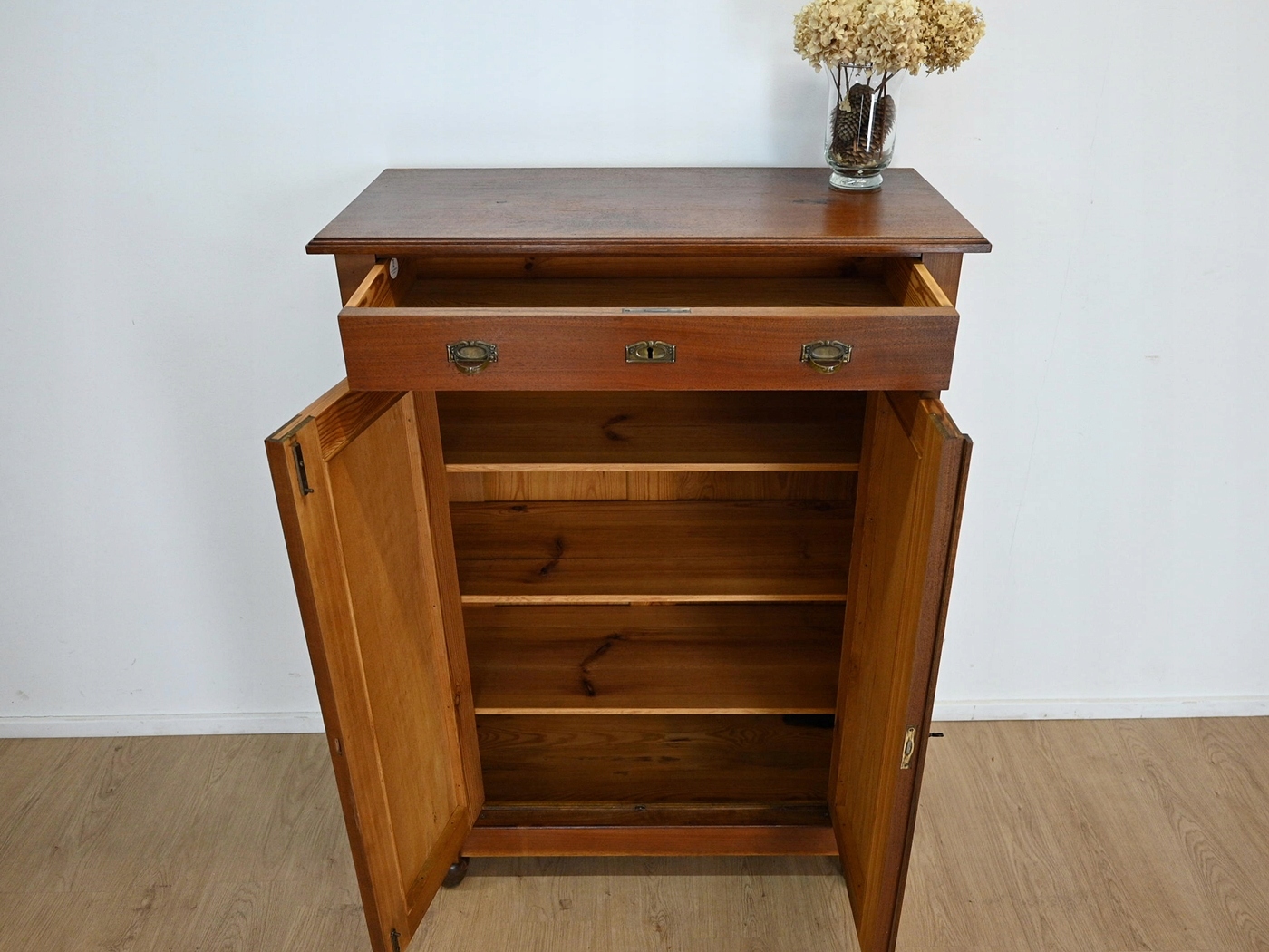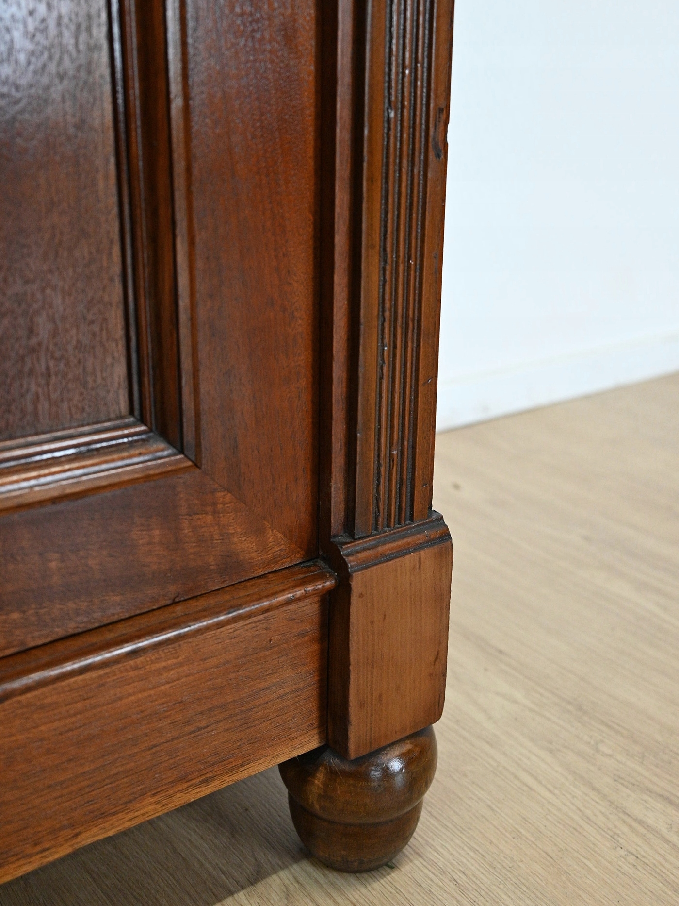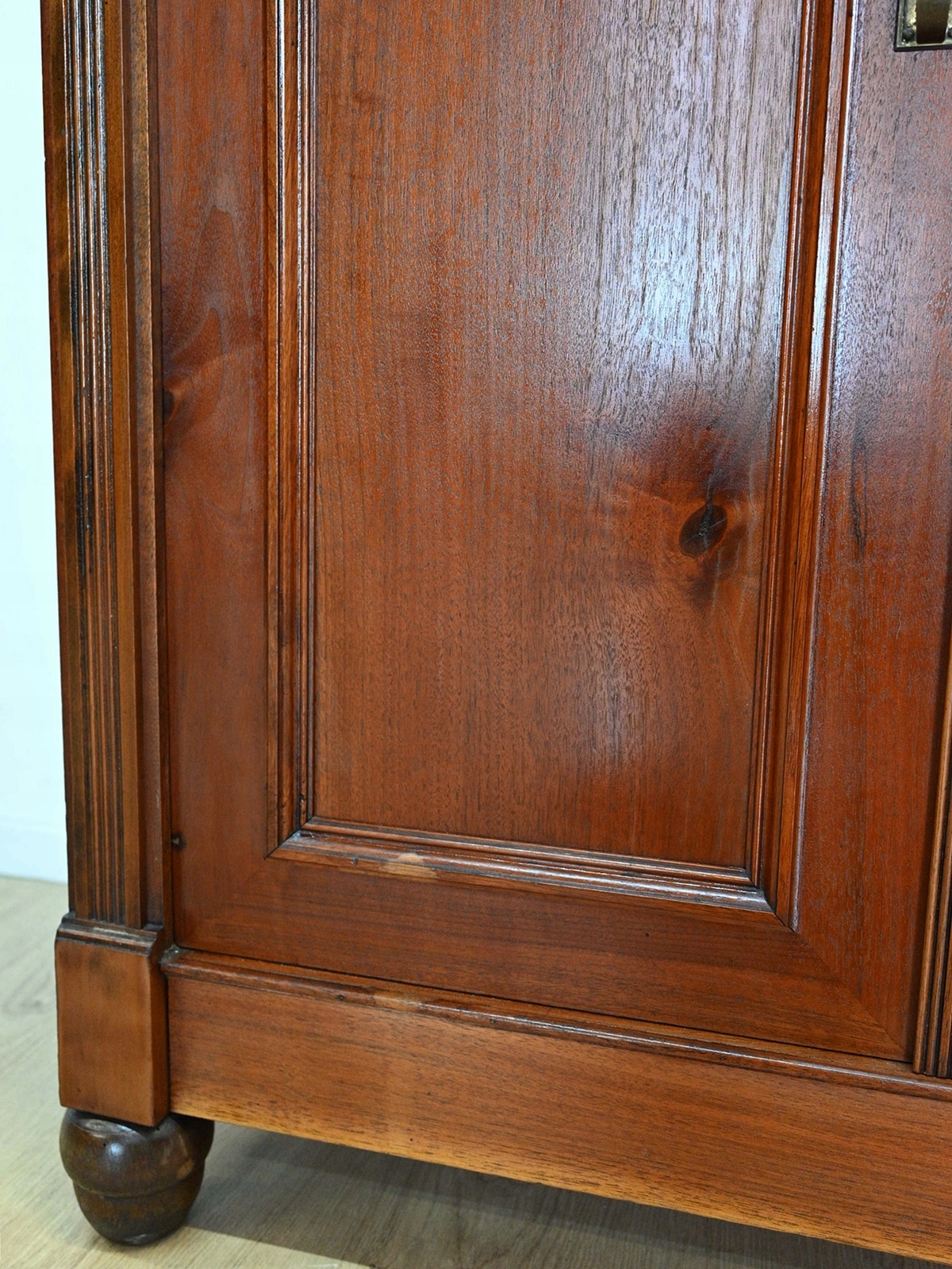 В очень хорошем состоянии. Мебель готова к использованию. Обновились внешние поверхности и интерьер мебели. Мебель уже старая и следы прошлого, не влияющие на ее эстетическое восприятие, являются доказательством подлинности мебели. Полку для белья можно сразу переносить в квартиру.