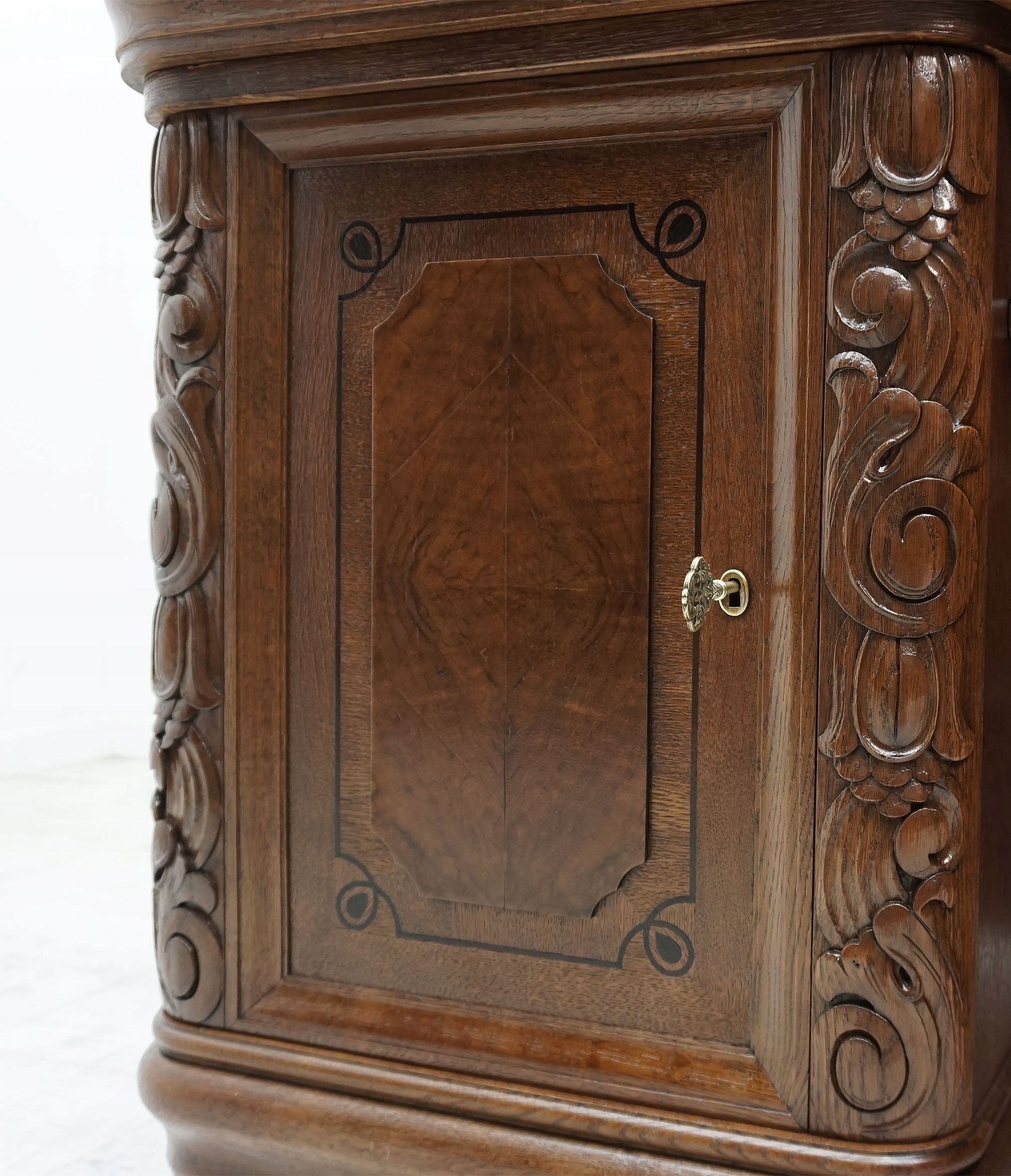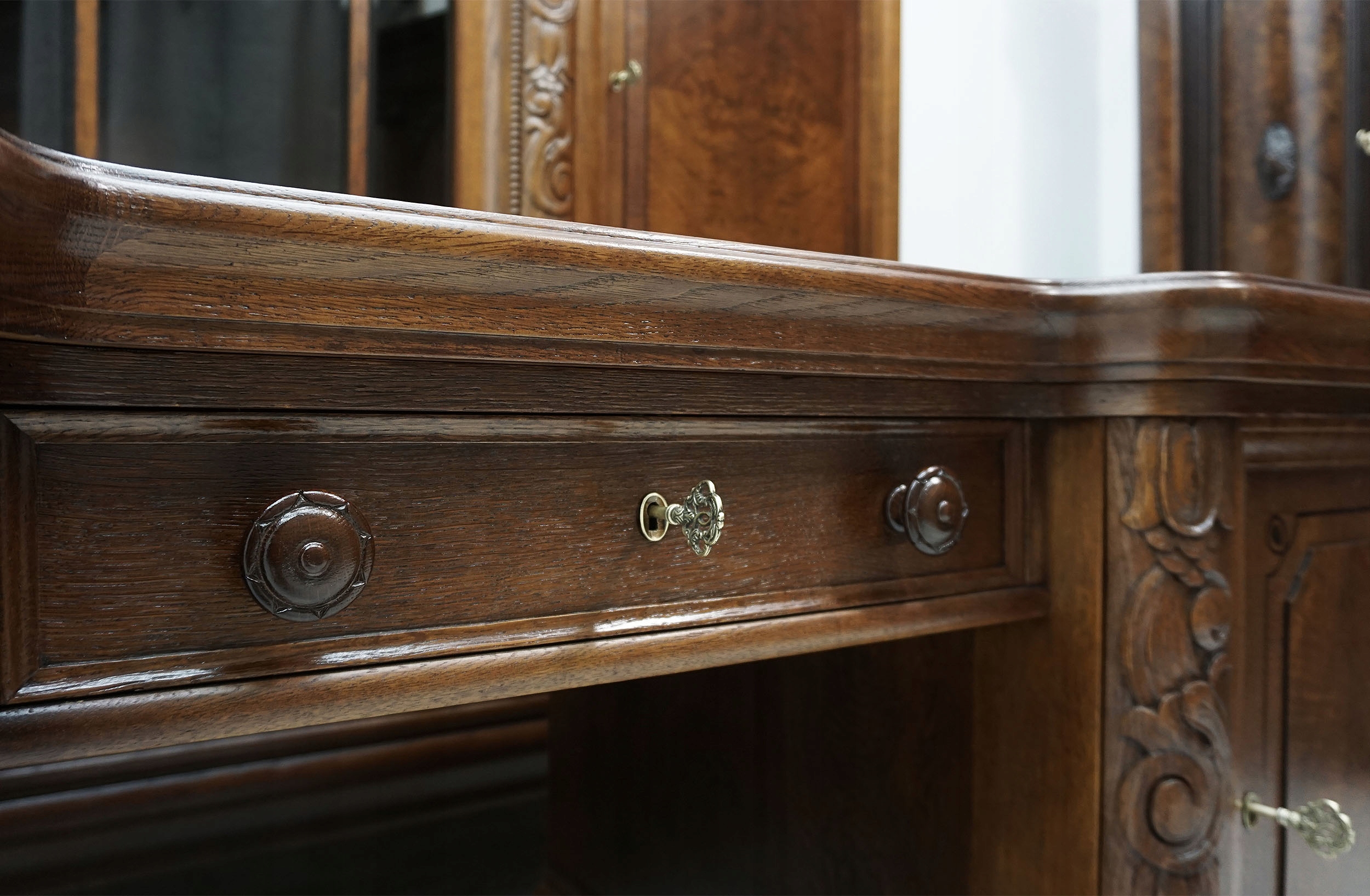 Представляем комплект офисной мебели, состоящий из библиотеки, письменного стола и кресла. Мебель изготовлена из древесины дуба и ореха. Набор был тщательно отремонтирован с особым вниманием к деталям. Богатую текстуру древесины дуба подчеркнули благодаря использованию морилки теплого коричневого оттенка. Столярные изделия покрыты множеством слоев полуматового лака, благодаря которому древесина эффективно защищена от внешних факторов.