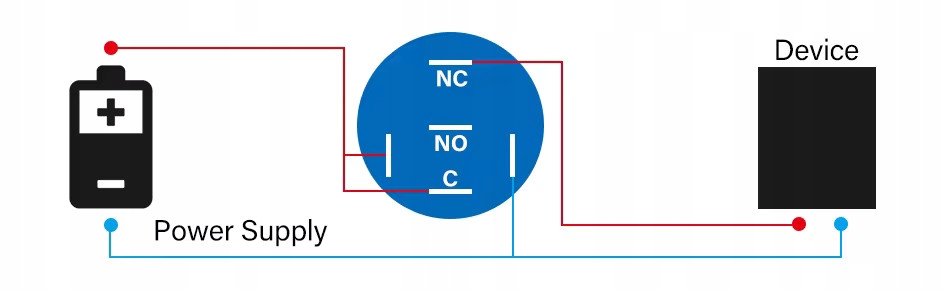 Принцип работы: Нормально разомкнутая цепь НЕТ. Светодиод загорается, указывая напряжение на выключателе. Нажатие кнопки замыкает цепь (запускает устройство) и выключает светодиод,