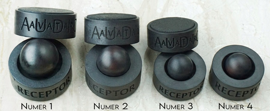 Комплект ножек RECEPTOR НОМЕР 3 состоит из 6 дисков (3 шайбы и 3 крышки) из нашего фирменного материала с антивибрационным слоем снизу и 3 шариков из экзотического дерева, выбран из 9 протестированных видов.