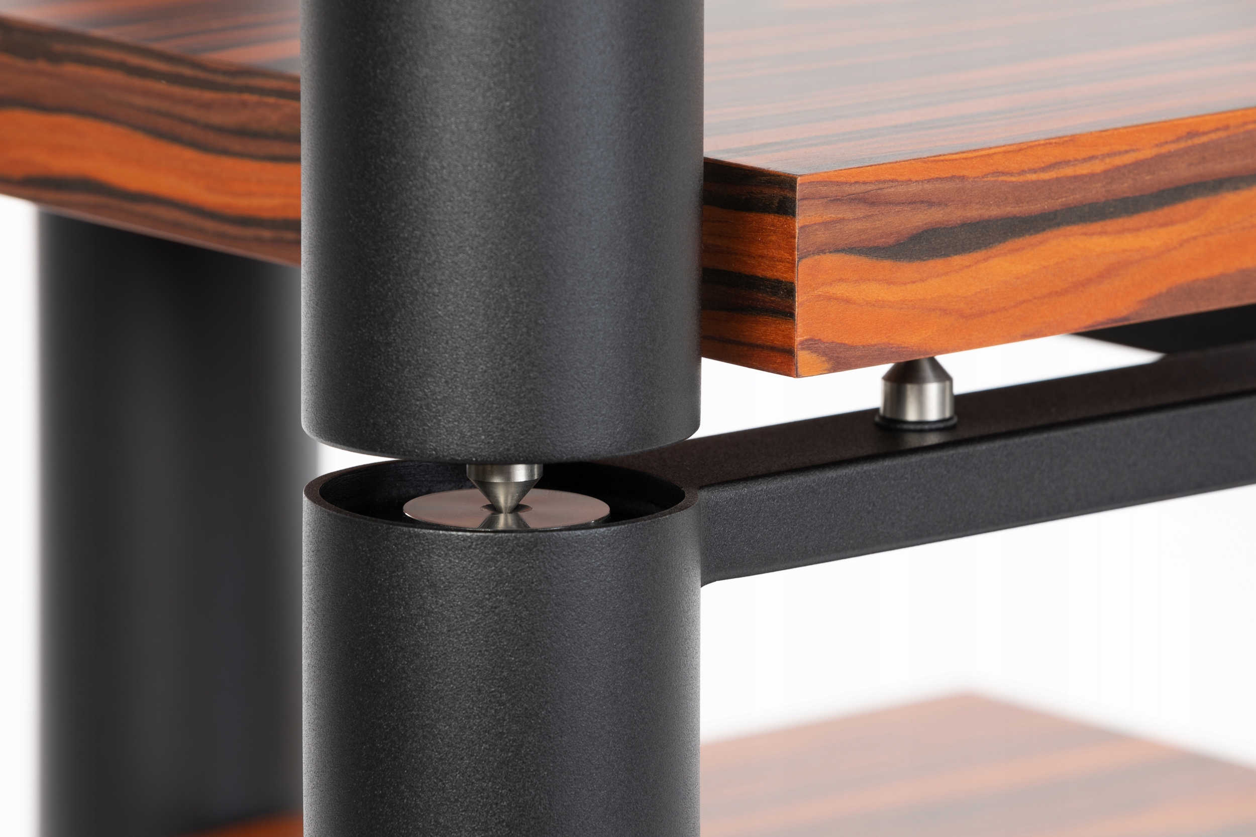 Трехногий трехуровневый стол со столешницей, покрытой шпоном палисандра. Цвет оправы – черный (матовый, мелкая структура). Конструкция состоит из отдельных модулей, которые можно размещать вертикально (один над другим, в любом порядке) или рядом. Каждый модуль отделен от других с помощью регулируемых конусов и антивибрационных прокладок. Возможно дальнейшее расширение дополнительными модулями.