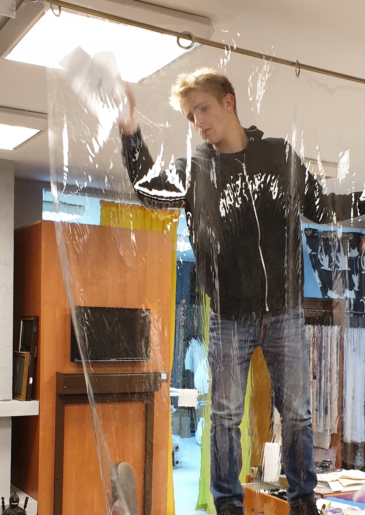 Прозрачная рулонная штора, в которой мы заменили традиционную затеняющую ткань на пленку ПВХ с прозрачностью 80%. Цель, конечно же, снизить риск заражения широко распространенными вирусами.