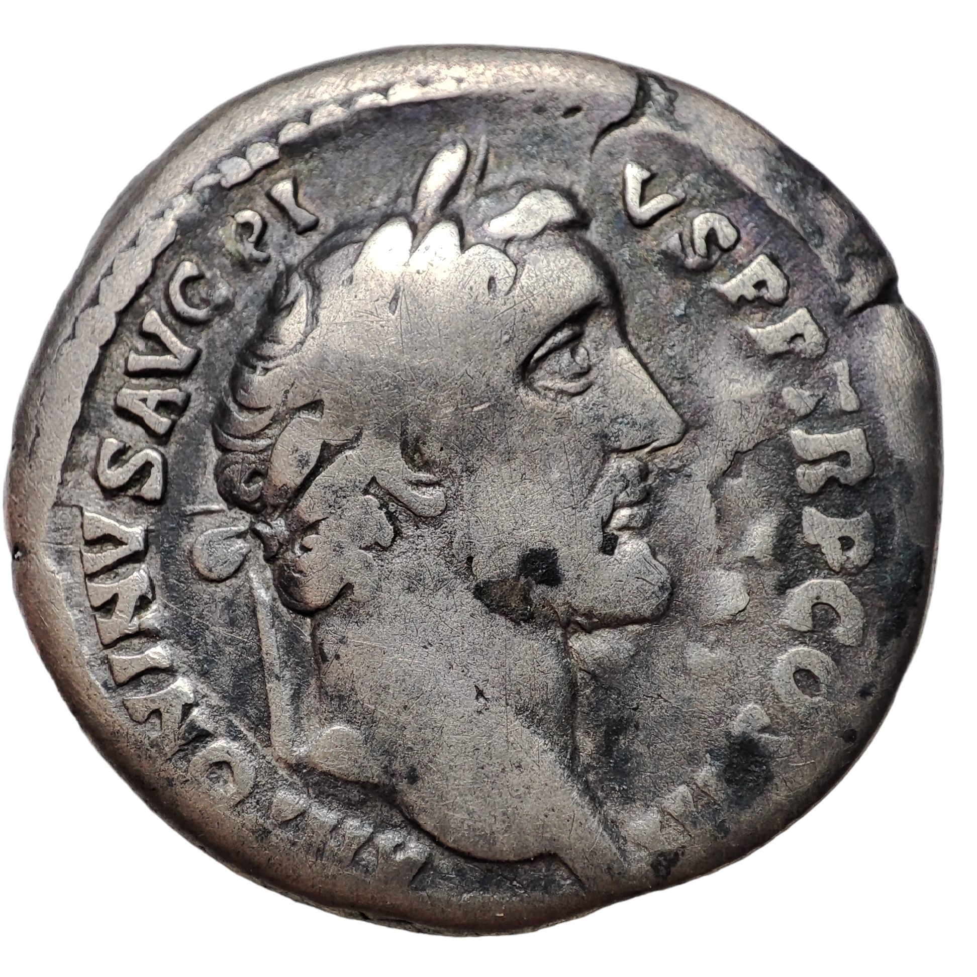 Серебро, аверс: ANTONINVS AVG PIVS P P TR P COS III, голова Антонина Пия в лавровом венке, обращенная вправо. Реверс: AVRELIVS CAESAR AVG PII F COS, голова Марка Аврелия обращена вправо. Артикул: RIC 417a