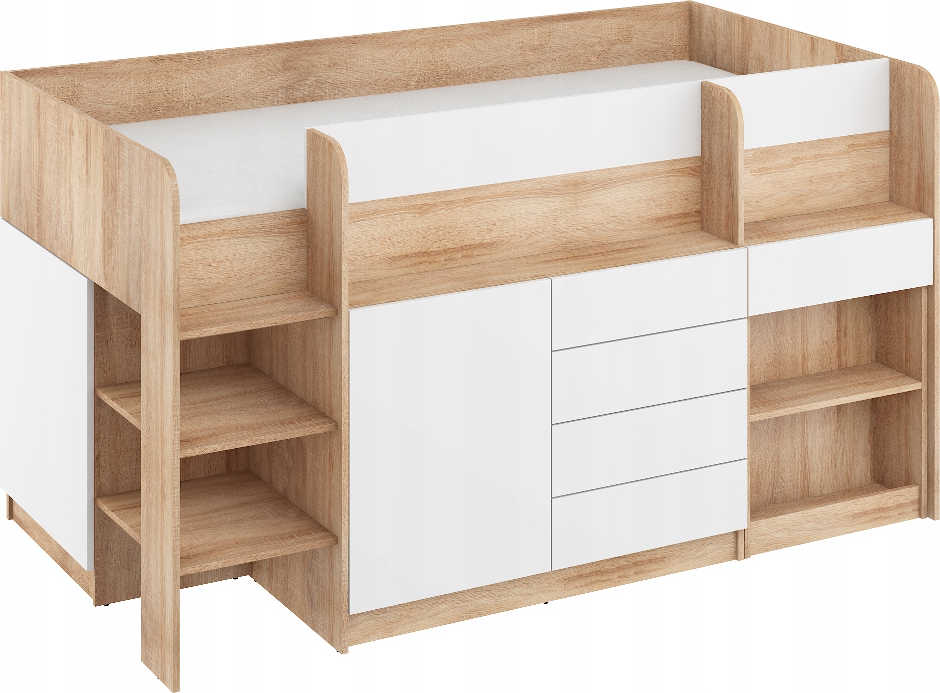 Мебель состоит из двухъярусной кровати, выдвижного письменного стола, 2 закрытых шкафов, 4 ящиков и множества полок.