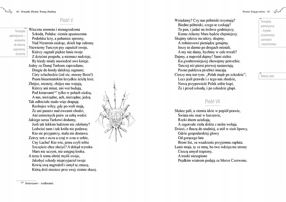 (...) книга «Эфразы, песни, плачи, псалмы» безусловно, одного из самых выдающихся поэтов эпохи Возрождения Яна Кохановского (1530 – 1584), входящая в цикл «Чтения» с проработкой. Это издание не содержит сокращений и сокращений. Итак, песни готовы. Их выбор также не случаен. В книгу вошли важнейшие произведения писателя, с которыми учащиеся работают на уроках польского языка, чаще всего в 7-м классе начальной школы, а затем и в средней школе. Экземпляр полностью адаптирован к текущей основной учебной программе (...) Кроме того, материалы из этой серии содержат вопросы с ответами, которые очень часто встречаются в тестах. Такие дополнения помогут учащимся закрепить и усвоить материал, а при необходимости вспомнить его, например, перед экзаменом в восьмом классе. Обучение становится более приятным благодаря черно-белым иллюстрациям на страницах книг. Что немаловажно, книги этой серии изданы добротно и эстетично и при этом недороги, что, безусловно, является стимулом пополнить свою библиотеку произведениями из этой серии.