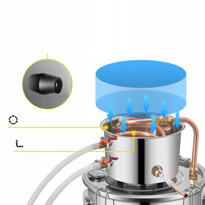 ✔️ Циркуляция охлаждающей воды требуется, когда температура достигает примерно 80 градусов. Этот аппарат для перегонки спирта имеет дополнительную бочку для специй, куда можно добавлять специи или травы по мере необходимости для корректировки вкуса.
