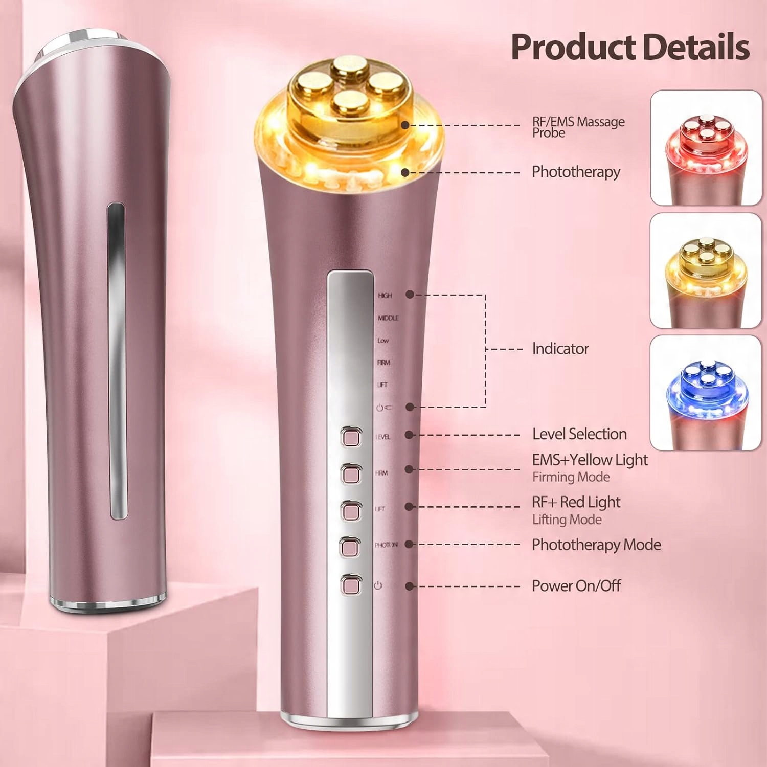 Массажер для лица удаляет морщины, красный свет стимулирует выработку коллагена и уменьшает тонкие линии и морщины. Синий свет борется с бактериями и улучшает состояние прыщей. Желтый свет уменьшает пятна и улучшает тон кожи.
