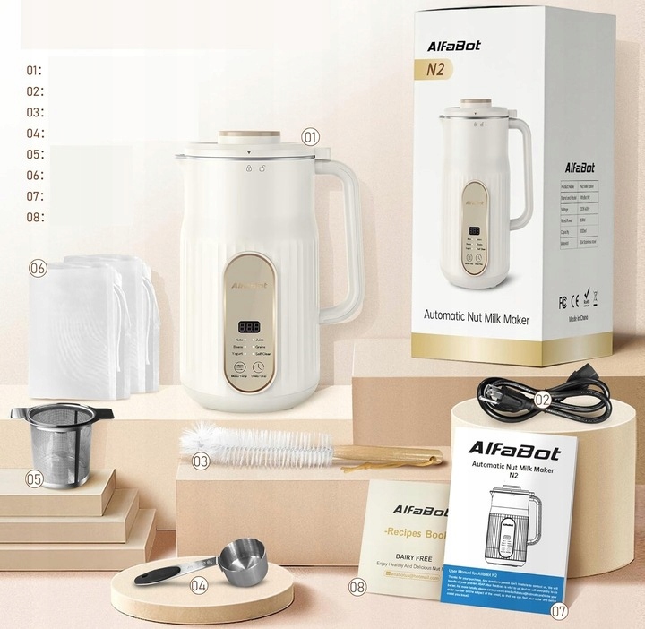 Модель AlfaBot N2 имеет емкость 1000 мл (т.е. около 35 унций или 5 чашек) и работает с мощностью 800 Вт при 230 В. Корпус изготовлен из нержавеющей стали и пищевого пластика. Устройство оснащено высокопроизводительным двигателем с десятью лезвиями из нержавеющей стали, благодаря которому оно может обрабатывать более твердые ингредиенты, такие как орехи и соевые бобы.