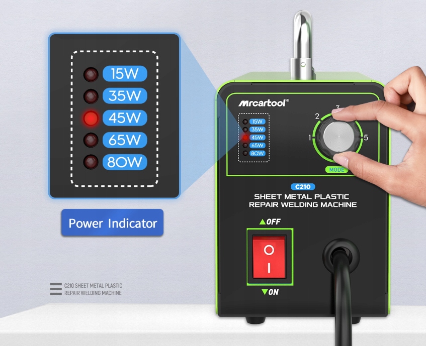 Mrcartool C210 может регулировать мощность в диапазоне 15 Вт, 35 Вт, 45 Вт, 60 Вт, 80 Вт в зависимости от модели. из различных пластиковых материалов, что позволяет сэкономить время и улучшить качество сварки.