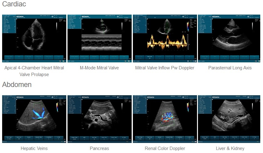 - Измерения для специализированных исследований: брюшная полость, мелкие органы (щитовидная железа, грудь, яички), опорно-двигательная система - скелетная МСК, сосудистая, кардиология, акушерство и гинекология, урология, поверхностная (например, анестезиология, ревматология), педиатрия, собственная.