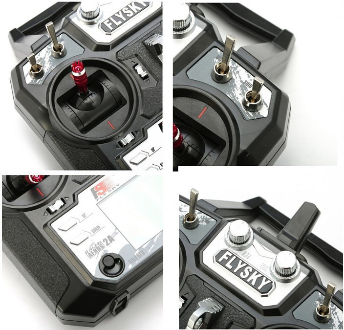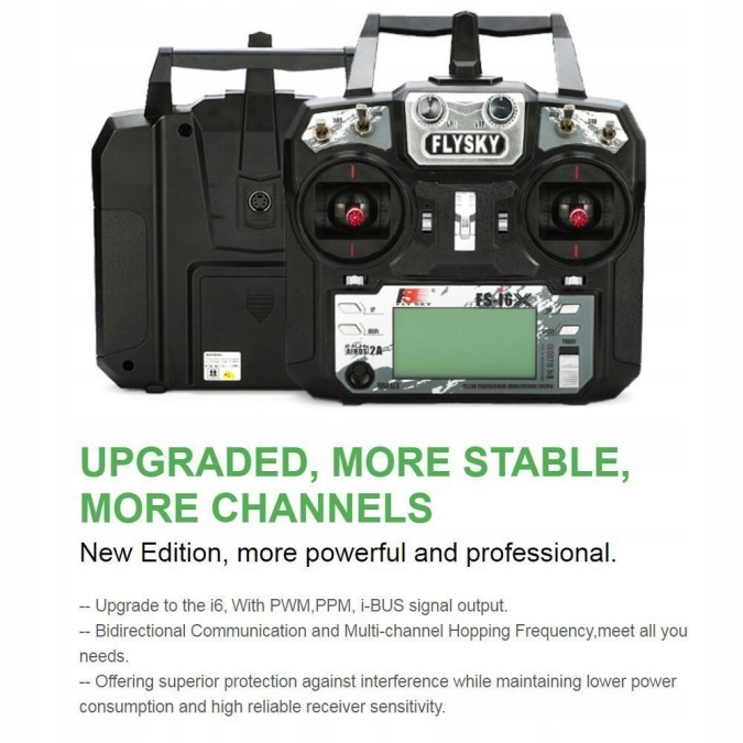Передатчик с выбором количества каналов от 6 до 10 (по умолчанию 6) предназначен для дистанционно управляемых летающих моделей - планеров, самолетов, вертолетов и т.п. Передатчик имеет четкий ЖК-дисплей с подсветкой. Устройство работает в системе AFHDS/AFHDS2 на частоте 2,4 ГГц. Цифровая триммировка и простое программирование отличают этот передатчик от других моделей, а комфорта также добавляют переключатели и ручки изменения режима полета, настроек закрылков и т. д. Кроме того, передатчик можно расширить за счет дополнительных приемников телеметрии и широкого набора датчиков. 6-канальный приемник iA6B обладает функциями защиты от помех и высокой рабочей чувствительностью. Комплект обеспечивает дальность действия до 1 километра.
