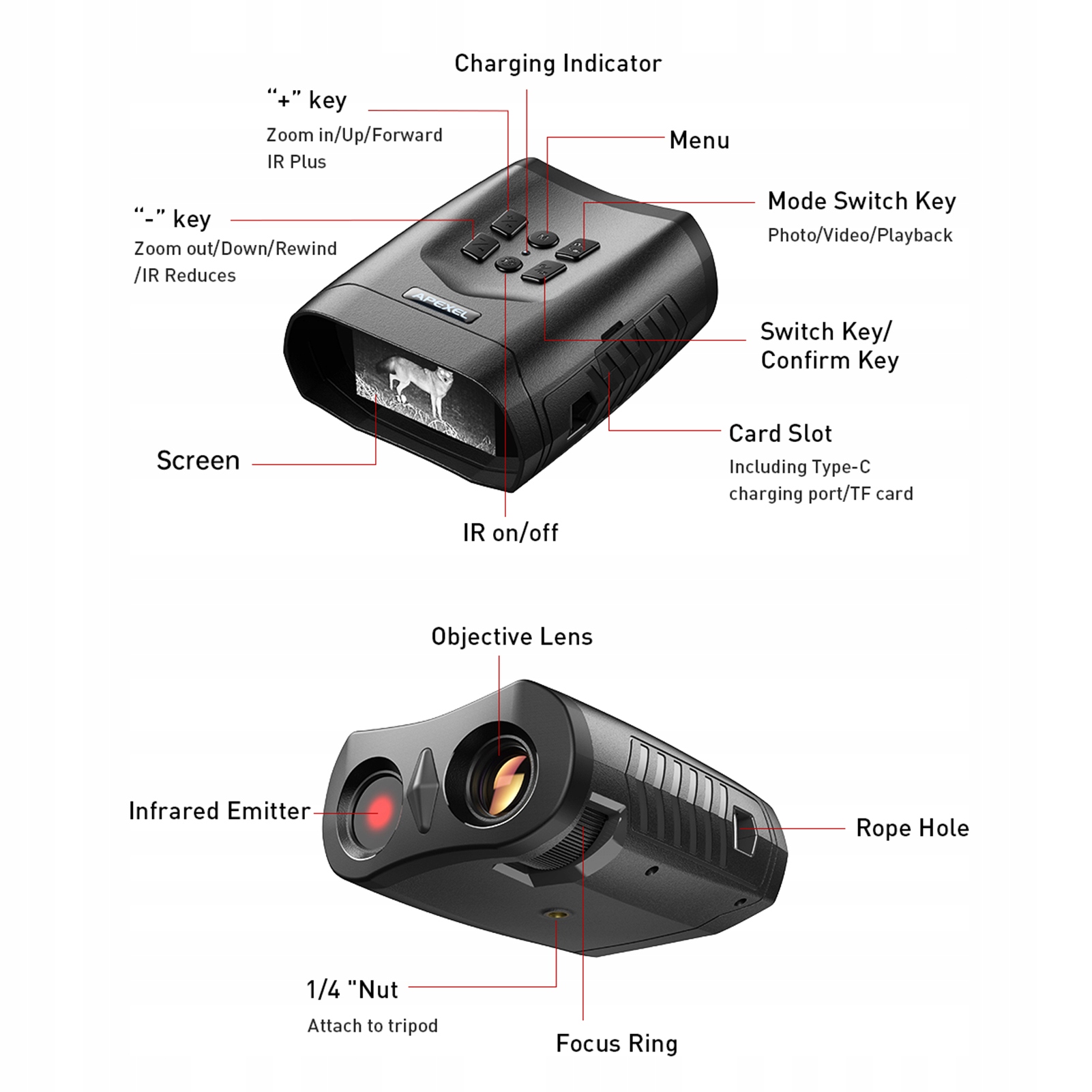 - 【Большой 3-дюймовый ЖК-экран】 Это высокое разрешение инфракрасного бинокля имеет большой 3-дюймовый ЖК-экран, обеспечивающий четкое и широкое зрение окружающей среды.