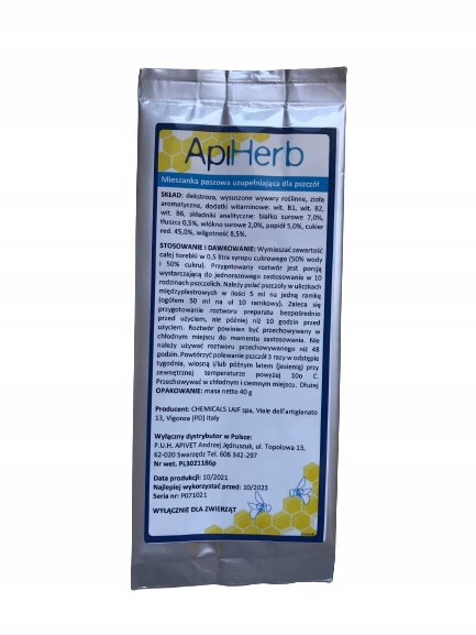 Смешайте содержание всей сумки в 0,5 литрах сахарного сиропа (50%воды и 50%сахара). Подготовленное решение представляет собой достаточную часть для одного использования одного времени в 10 семейных семей. Пчелы должны быть вылиты в интернет -стринах в размере 5 мл на кадр. Рекомендуется подготовить раствор для подготовки непосредственно перед использованием, не позднее, чем за 10 часов до использования. Решение следует хранить в прохладном месте до использования. Не используйте решение, хранящее более 48 часов. Повторите заливку пчел 3 раза в неделю, весной и/или в конце лета (осень) при внешней температуре выше 10? Храните в прохладном и темном месте.