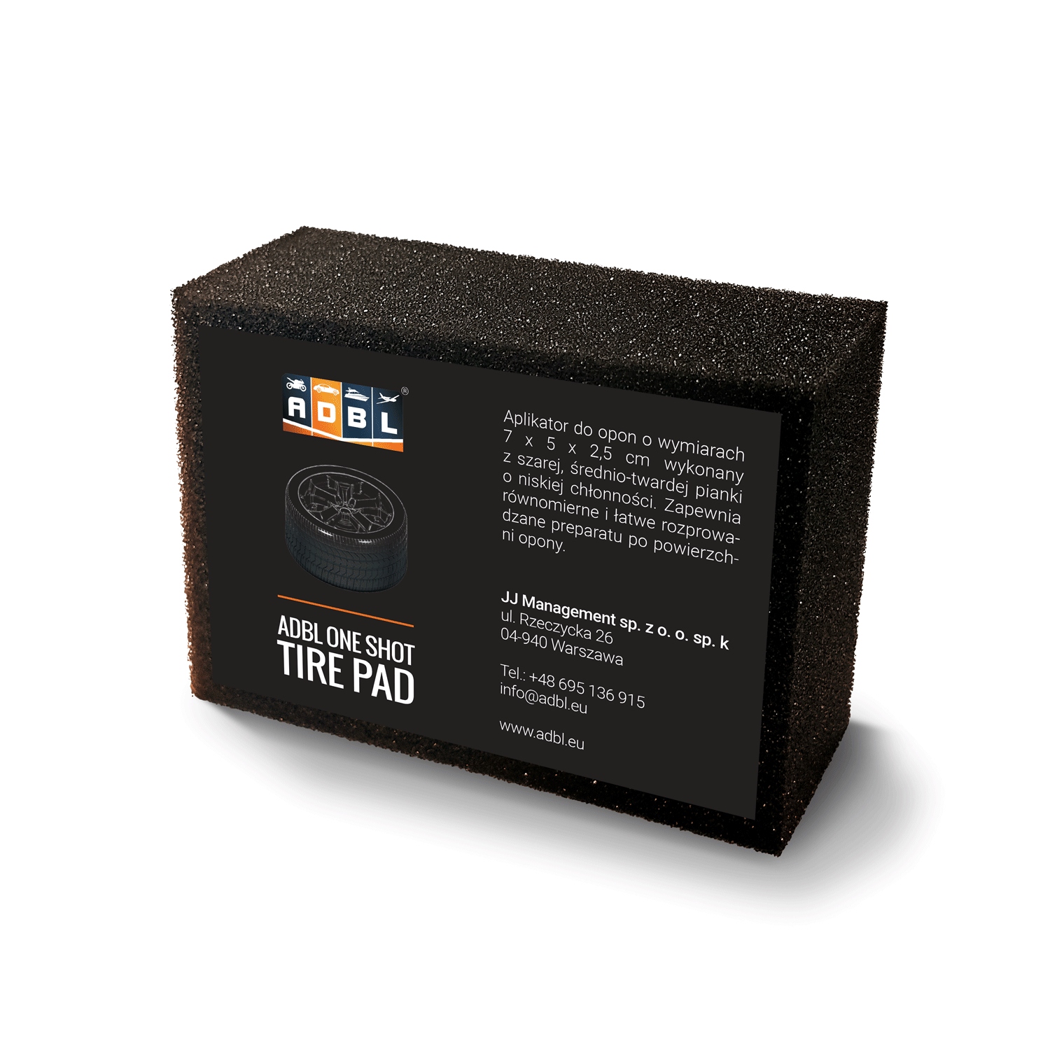 ADBL ONE SHOT TIRE PAD — аппликатор для шин размером 7 х 5 х 2,5 см, изготовленный из серой пены средней твердости с низкой впитываемостью. Обеспечивает равномерное и легкое распределение препарата по поверхности шины.