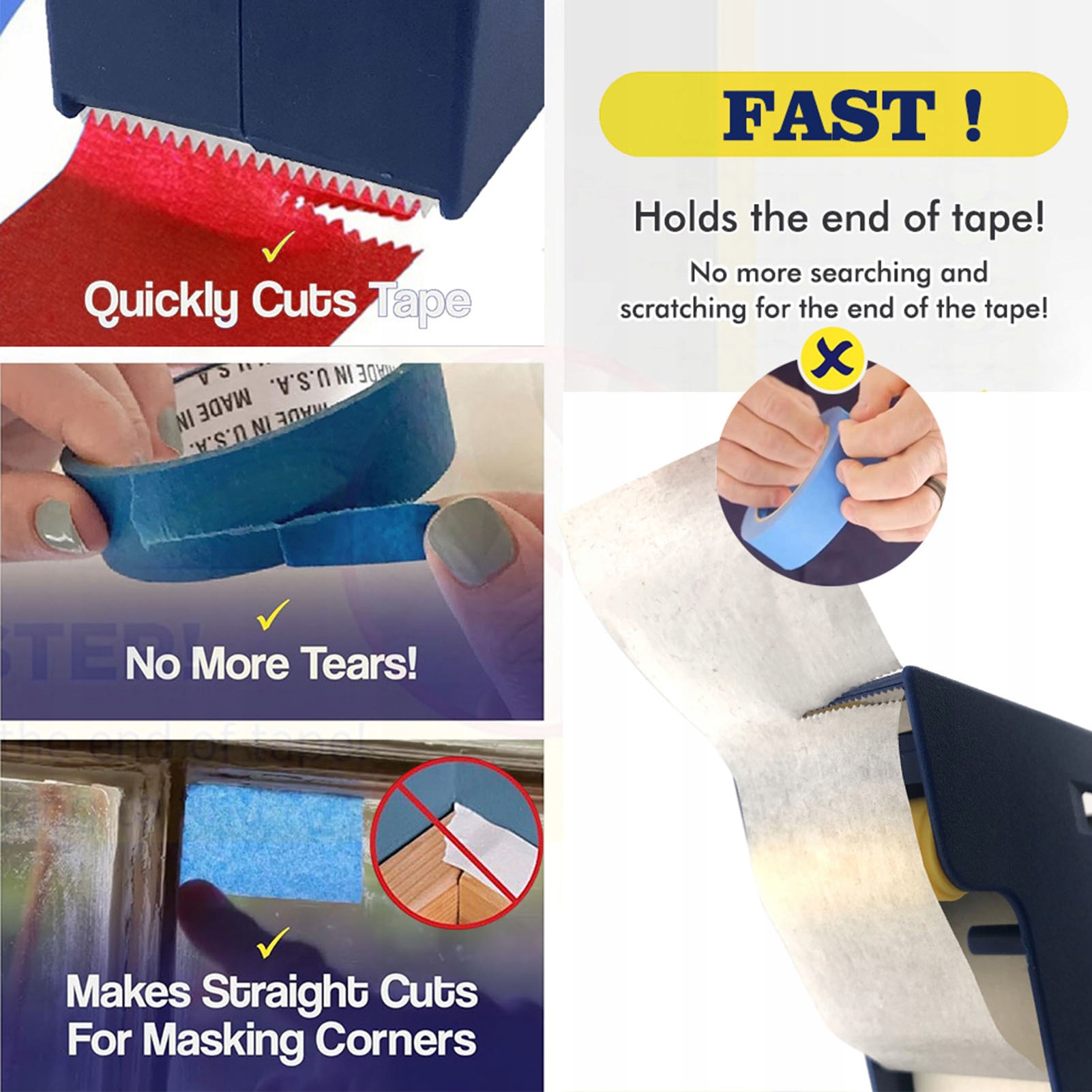 2. Зубчатый разрез: аппликатор малярной ленты имеет металлическую зубчатую конструкцию, которая обеспечивает чистый и аккуратный разрез каждый раз, обеспечивая точное нанесение ленты без неправильного размещения.