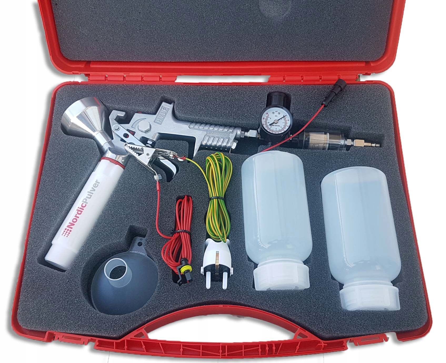 Совершенно новый пистолет для порошкового покрытия NordicPulver NP PRO PLUS — ЕС — сделано в Европе. Пистолет работает в системе ТРИБО - для работы устройства не требуется электричество (видимая на фото вилка используется только для быстрого и безаварийного заземления пистолета). Модель NP PRO PLUS представляет собой устройство с усовершенствованным дизайном и в то же время предлагает широкий спектр применения по разумной цене. Конструкция и конструкция пистолета позволяют осуществлять простую и быструю очистку, а также частую и беспроблемную смену цвета используемой краски без необходимости переливать краски в общие контейнеры (можно приобрести дополнительные пустые контейнеры и порошковые краски в специальных контейнерах). на других наших аукционах).