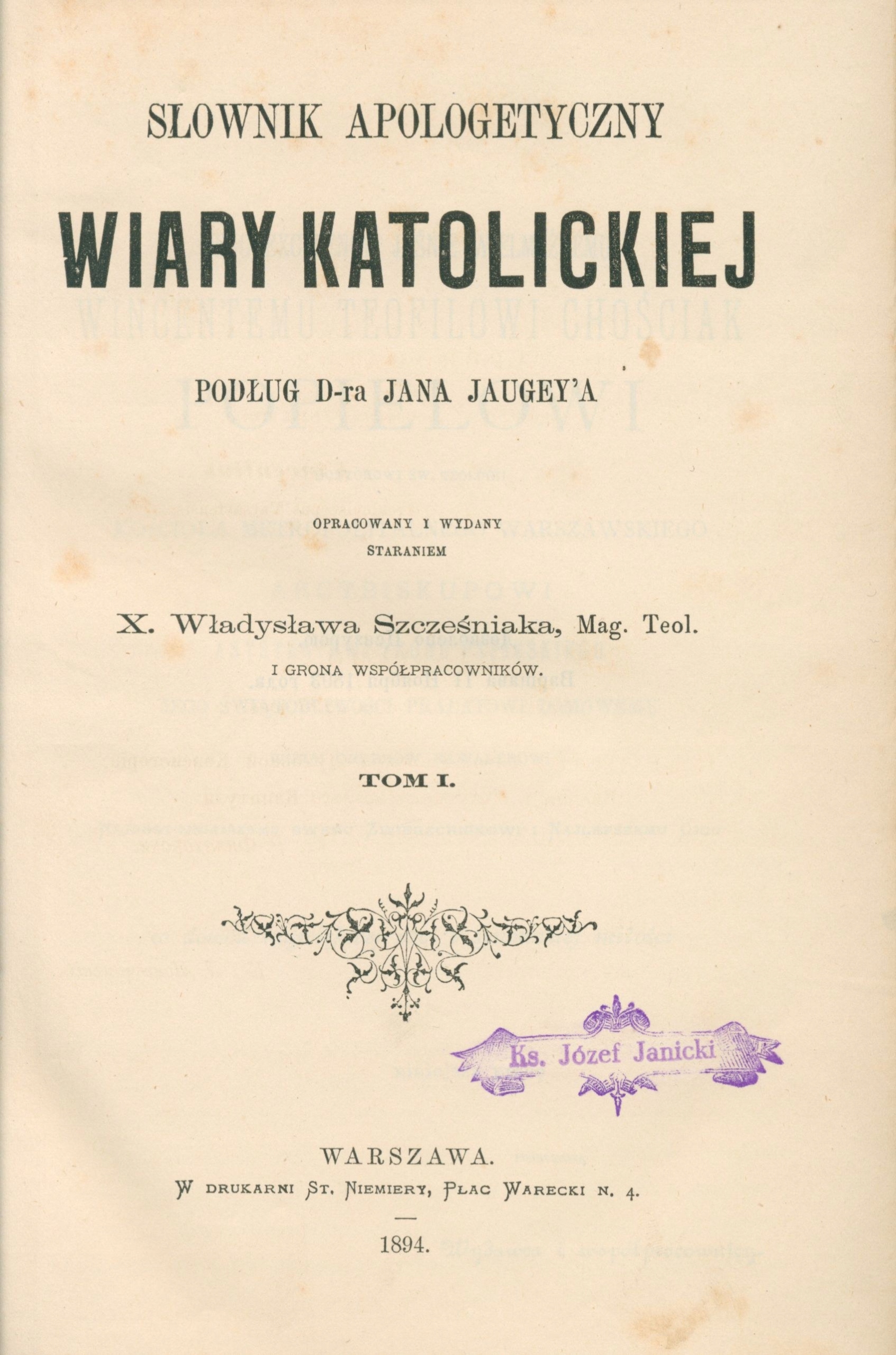 Обширный богословский и апологетический сборник, изданный в Варшаве в 1890-х годах. В издании в алфавитном порядке обсуждаются ключевые понятия, связанные с доктриной и защитой католической веры, в том числе: ересь, папская непогрешимость, учение отцов церкви, еретических движений и исторических деятелей (например, Яна Гуса), а также философские и моральные вопросы, такие как проблема свободы воли или практики, связанные с гипнозом.