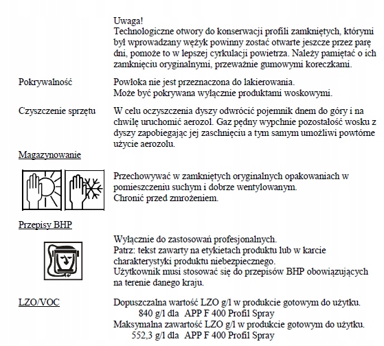<ул>APP F400 Profil Spray — сохраняющий эластичность гидрофобный препарат на основе минерального масла, парафина и пропиточных добавок для антикоррозионной защиты закрытых профилей и труднодоступных мест кузова автомобиля, таких как: кузов и дверные балки, моторный отсек и багажник.