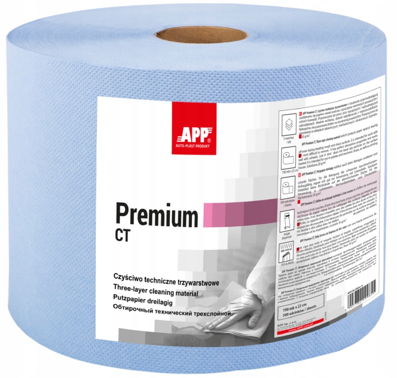 APP Premium представляет собой трехслойную тисненую салфетку с очень высокой механической прочностью во влажном состоянии и очень низкая запыленность б>. Предназначен для использования в окрасочных цехах для окончательной очистки поверхностей перед покраской. На механических заводах и в типографиях. Для мытья и протирания инструментов, верстаков или рук. Цвет: синий. Вес: 3х20 г/м². Ширина рулона: 22 см. Длина листа: 38 см. Длина протирочной ткани в рулоне: 190 м. Количество листьев: 500 шт..