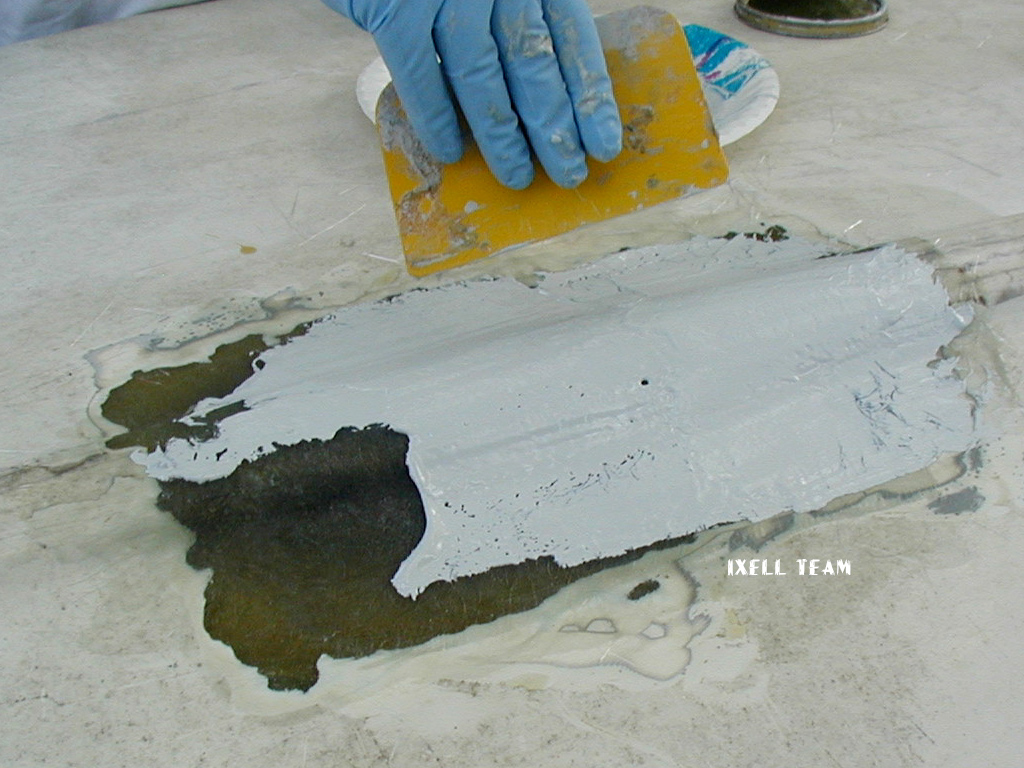 После высыхания смолы разровняйте ее полиэфирной шпаклевкой и обработайте механически или вручную наждачной бумагой зернистостью 80 – 120.