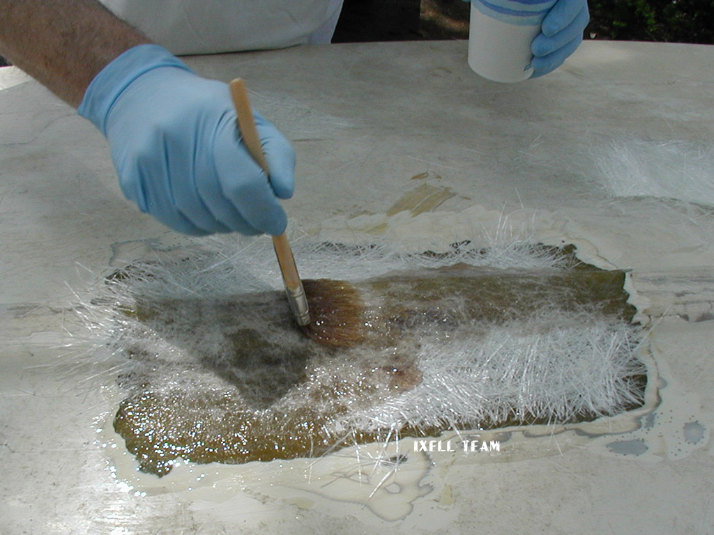 Нанесите кистью смолу, смешанную с отвердителем, на очищенную поверхность.