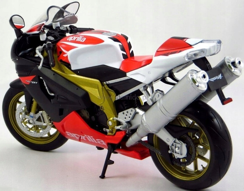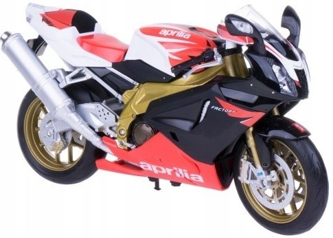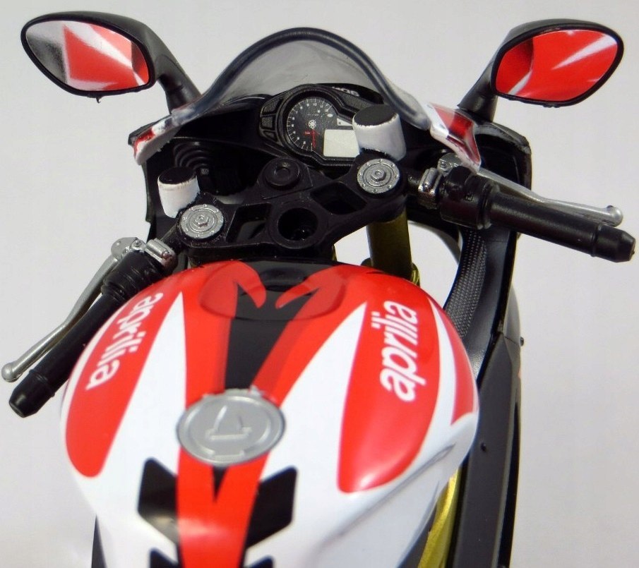 Модель мотоцикла Aprilia характеризуется вниманием к деталям. У него есть движущиеся элементы: колеса, рулевое колесо, задний маятник, боковая нога.