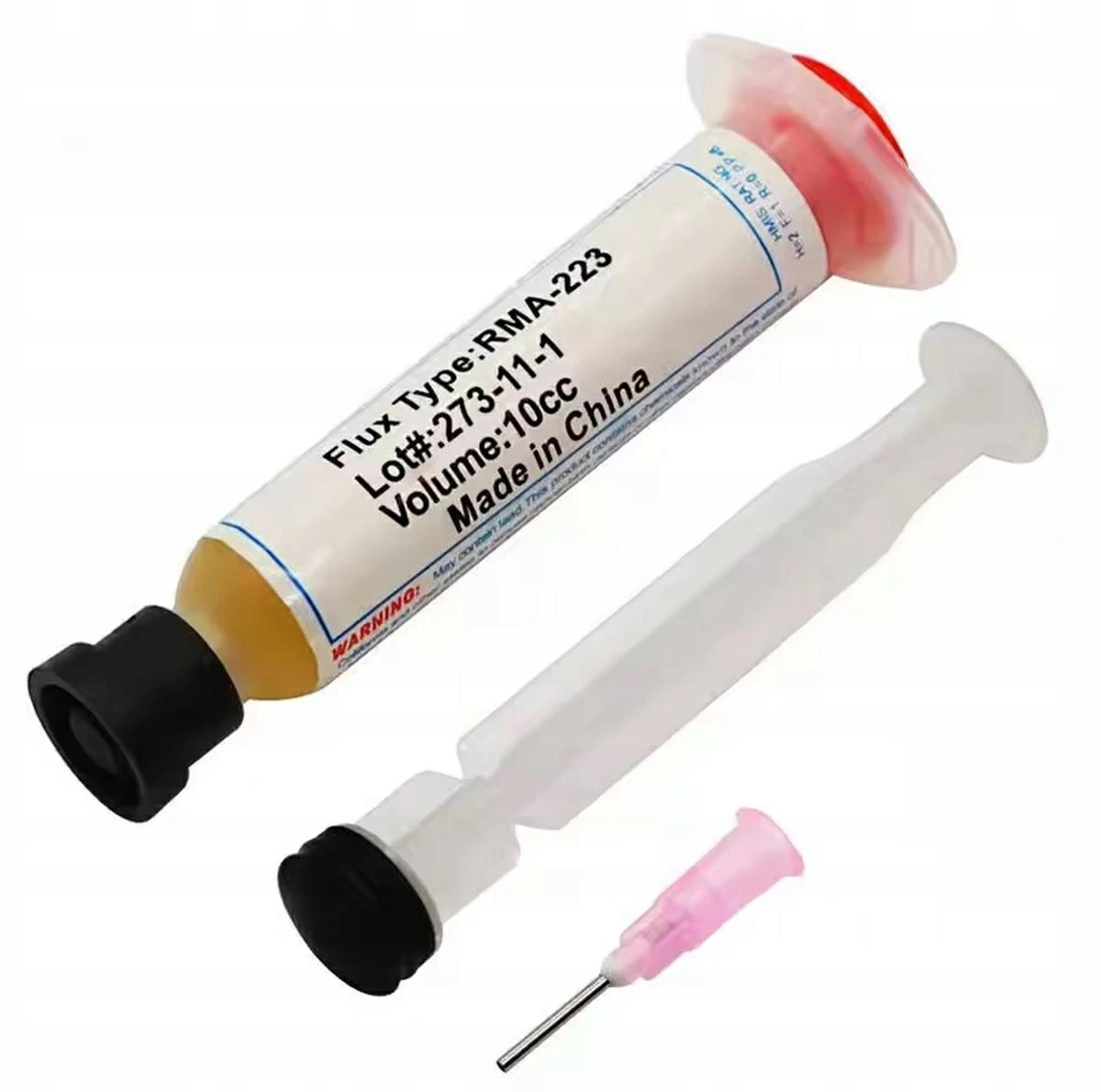 - Набор для пайки, оснащенный паяльным флюсом RMA-223 10cc, поршнем 19G и дозирующей иглой.