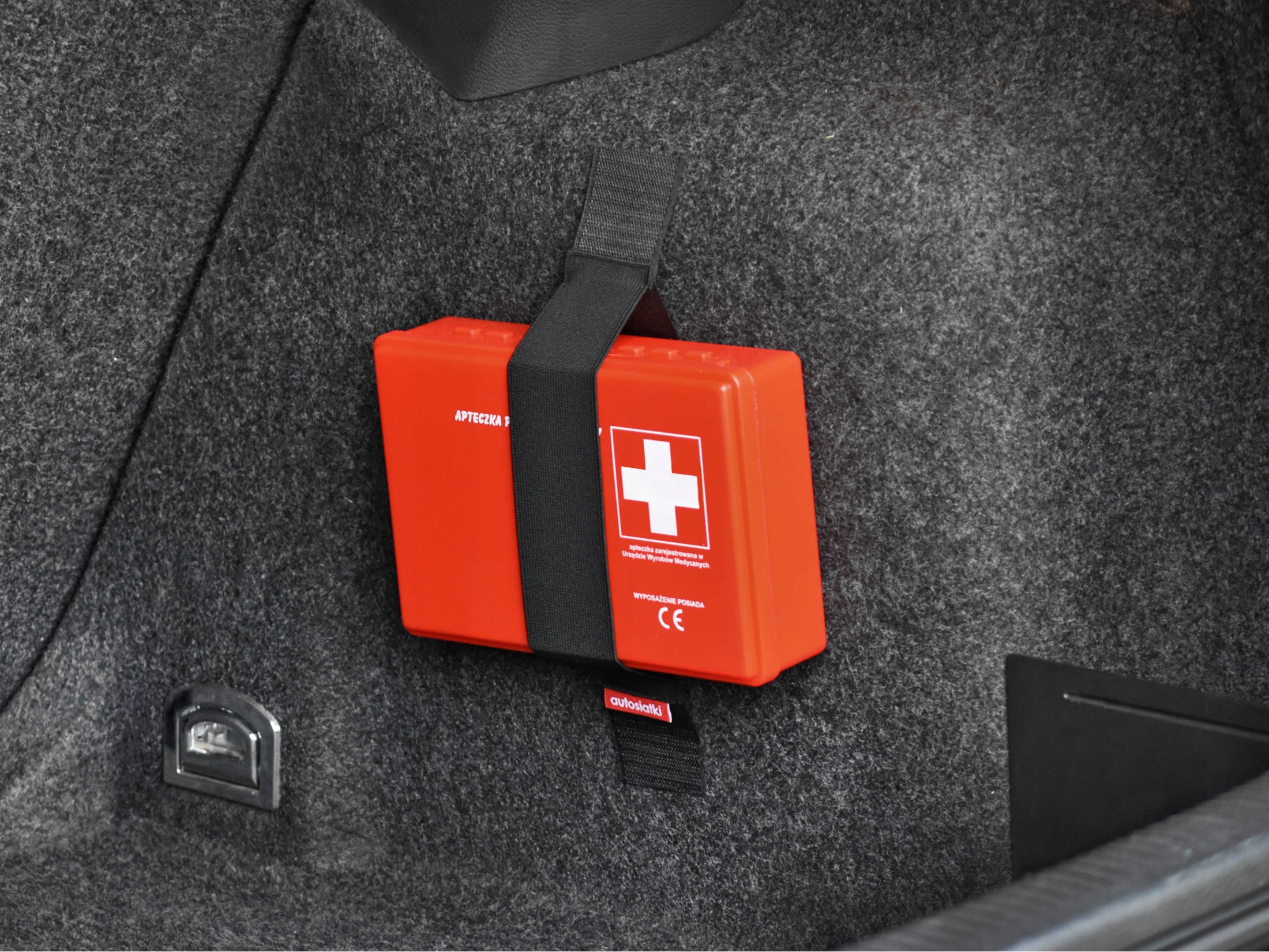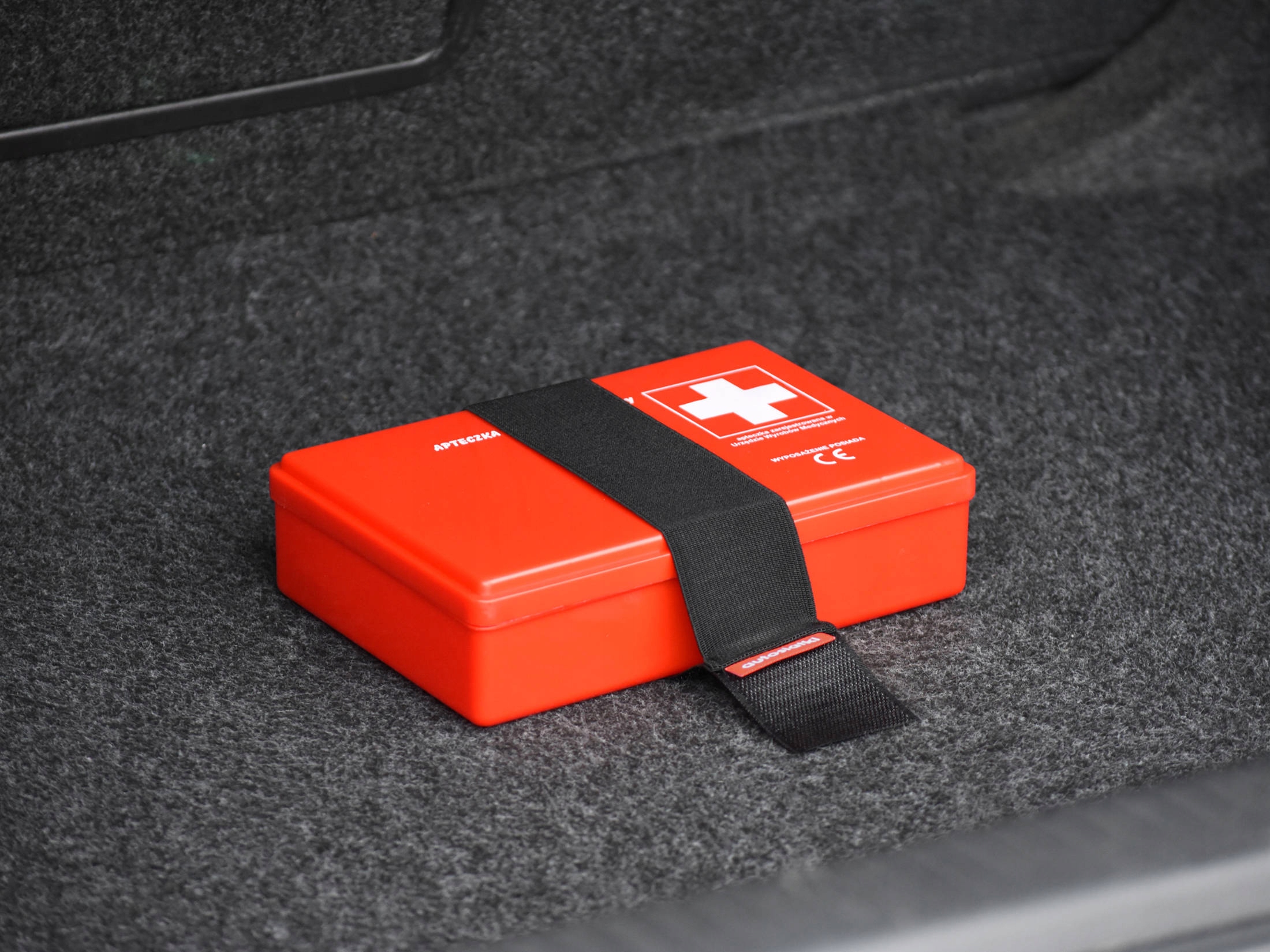Автомобильная аптечка с основным оборудованием. Изготовлен из пластика яркого цвета. Он имеет компактные размеры и достаточно места, чтобы дополнить его необходимыми перевязочными материалами и лекарствами в соответствии с индивидуальными потребностями. Крепится к обивке автомобиля с помощью практичной ручки из ленты-липучки. Перед покупкой убедитесь, что липучка прилипает к обивке багажника. Если липучка, например, от куртки или сумки, прилипнет к ковру, ручка будет вести себя точно так же.