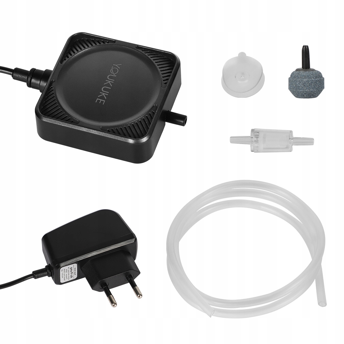Аквариумный воздушный насос набор Youkuke содержит 1-ваттный питание сети, 1 м длиной воздушной трубки, небольшой воздушный камень, клапан водотока, 1 всасывающий чашку для воздушного насоса и руководство пользователя.