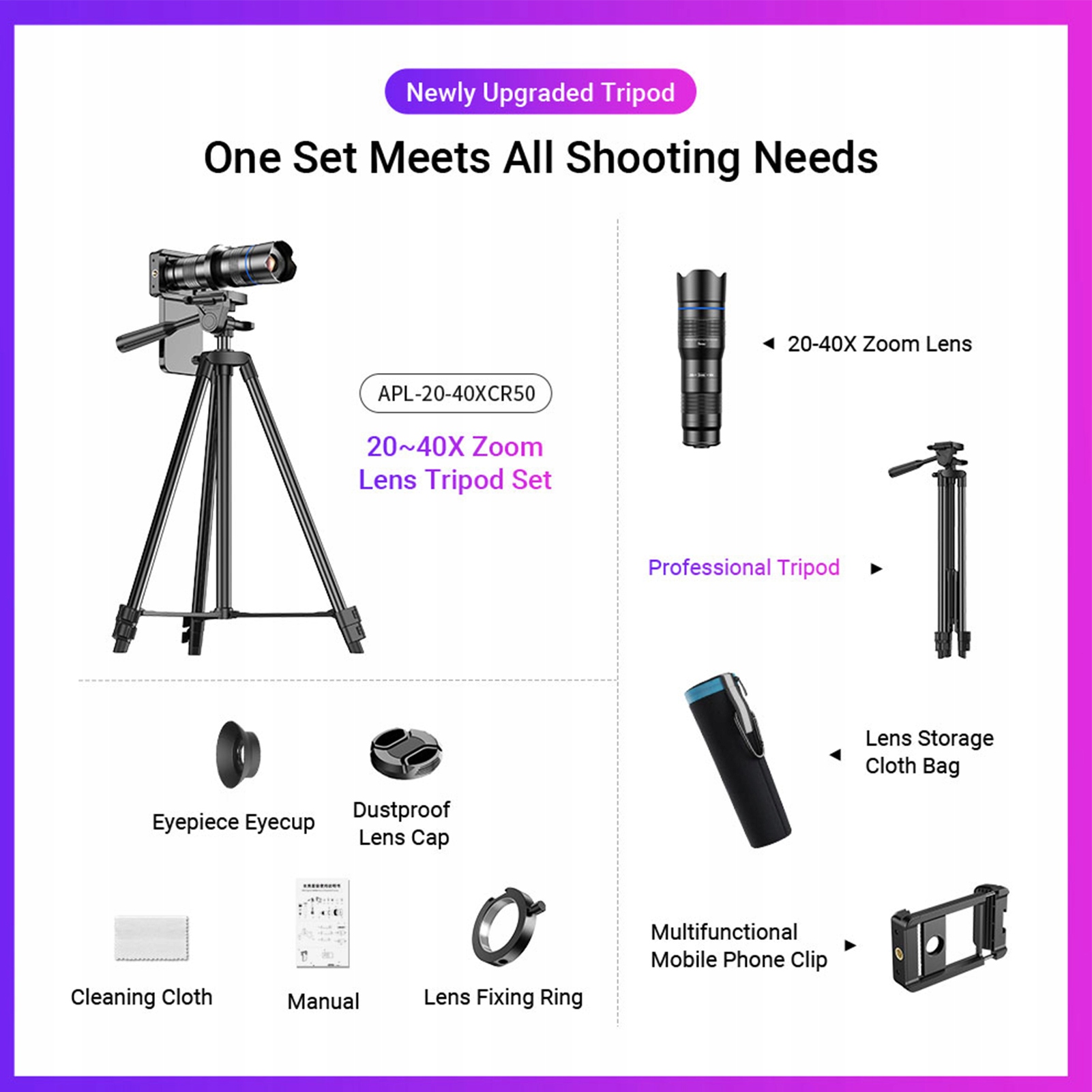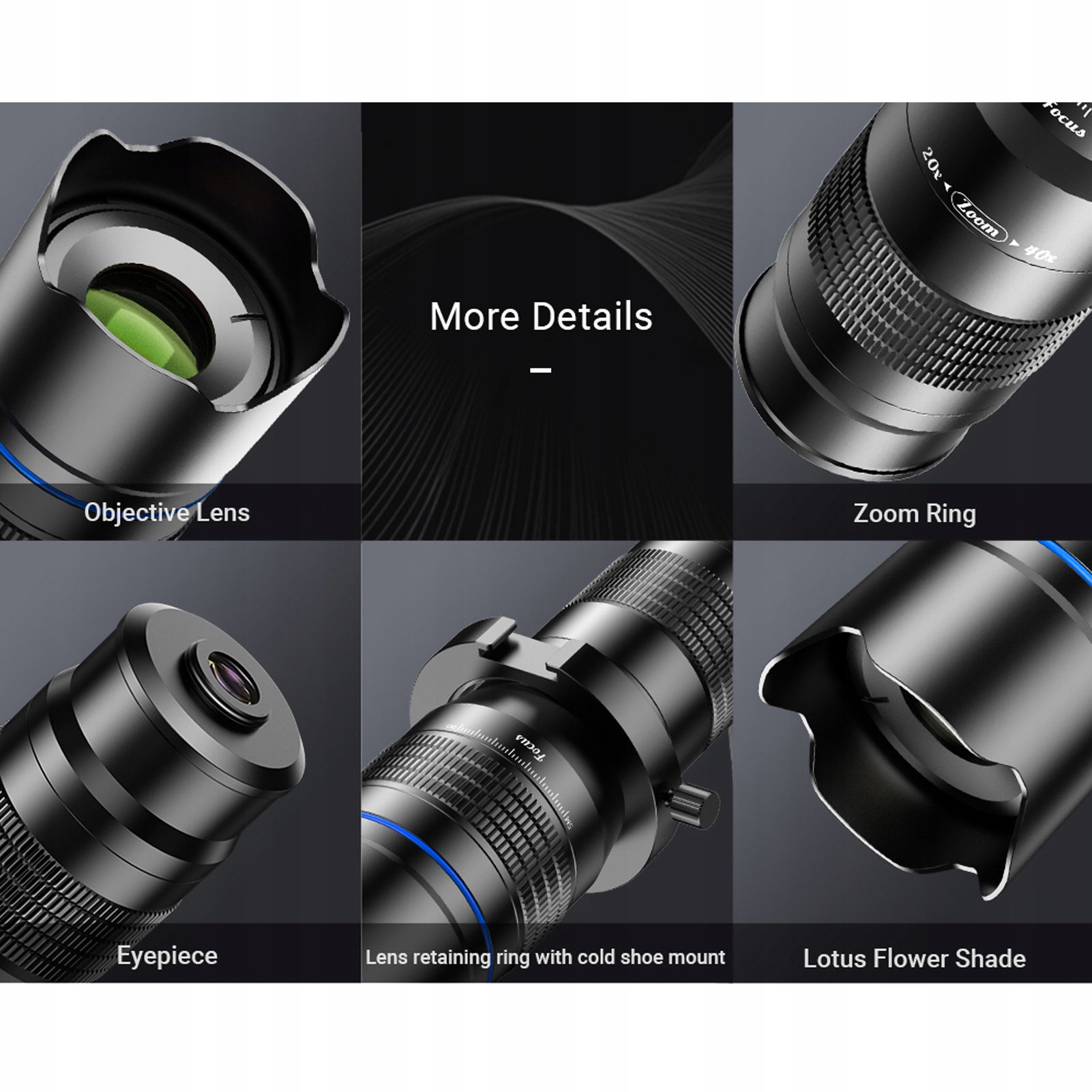 - 【Телеобъектив для телефона 20–40X】 Получите максимальное удовольствие от просмотра с нашим телескопом с увеличением 20–40X и высоким разрешением. Легко снимайте четкие изображения удаленных сцен, просто вращая кольцо фокусировки, устраняя темные пятна. Кроме того, он также может работать как монокулярный телескоп.