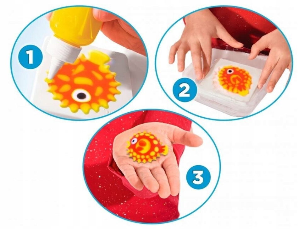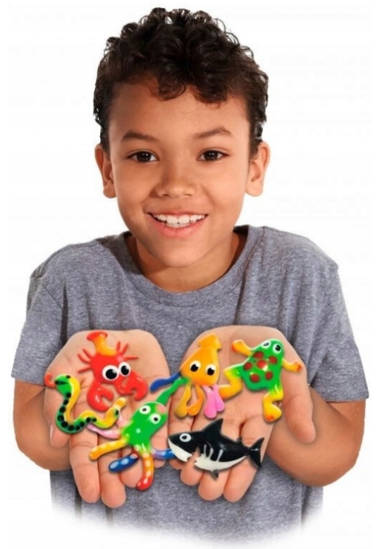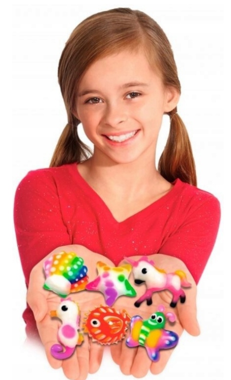 Порошок Aqua Gelz необходимо хорошо перемешать в емкости с водой, затем выбрать формочку и заполнить ее разноцветными гелями и когда он будет готов, погрузите его в воду, осторожно перемещая влево и вправо. Гелевое существо за несколько секунд превращается из плоского рисунка в чудесную трехмерную фигурку, оно само вытекает из формы, и с ним можно играть.