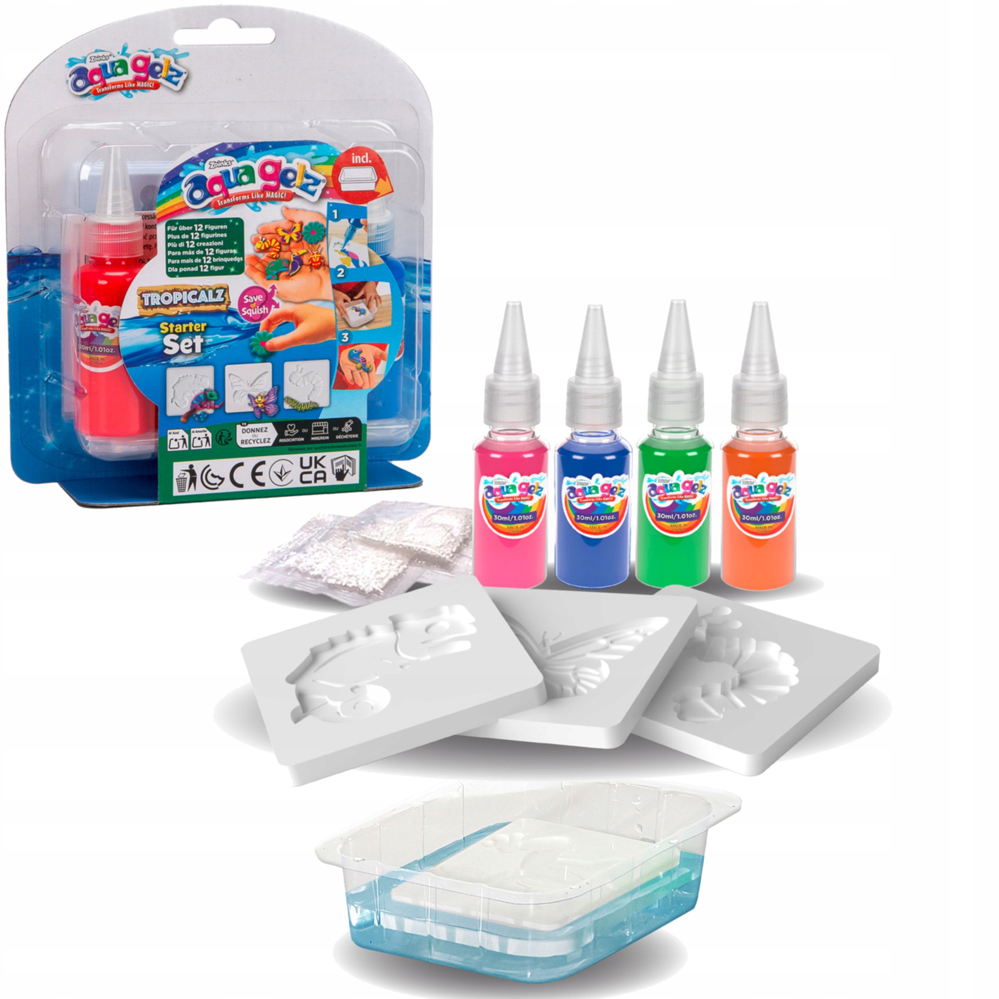 порошок aqua gelz должен быть хорошо перемешан в контейнере с водой , а затем выберите плесень, заполните его красочными гелями , и когда он готов, погрузите их в воду, мягко движущаяся вправо и слева. Гель Существо за несколько секунд поворота от плоского рисунка в замечательную 3D -фигурку , оно вытекает из формы, и вы можете играть с ним.