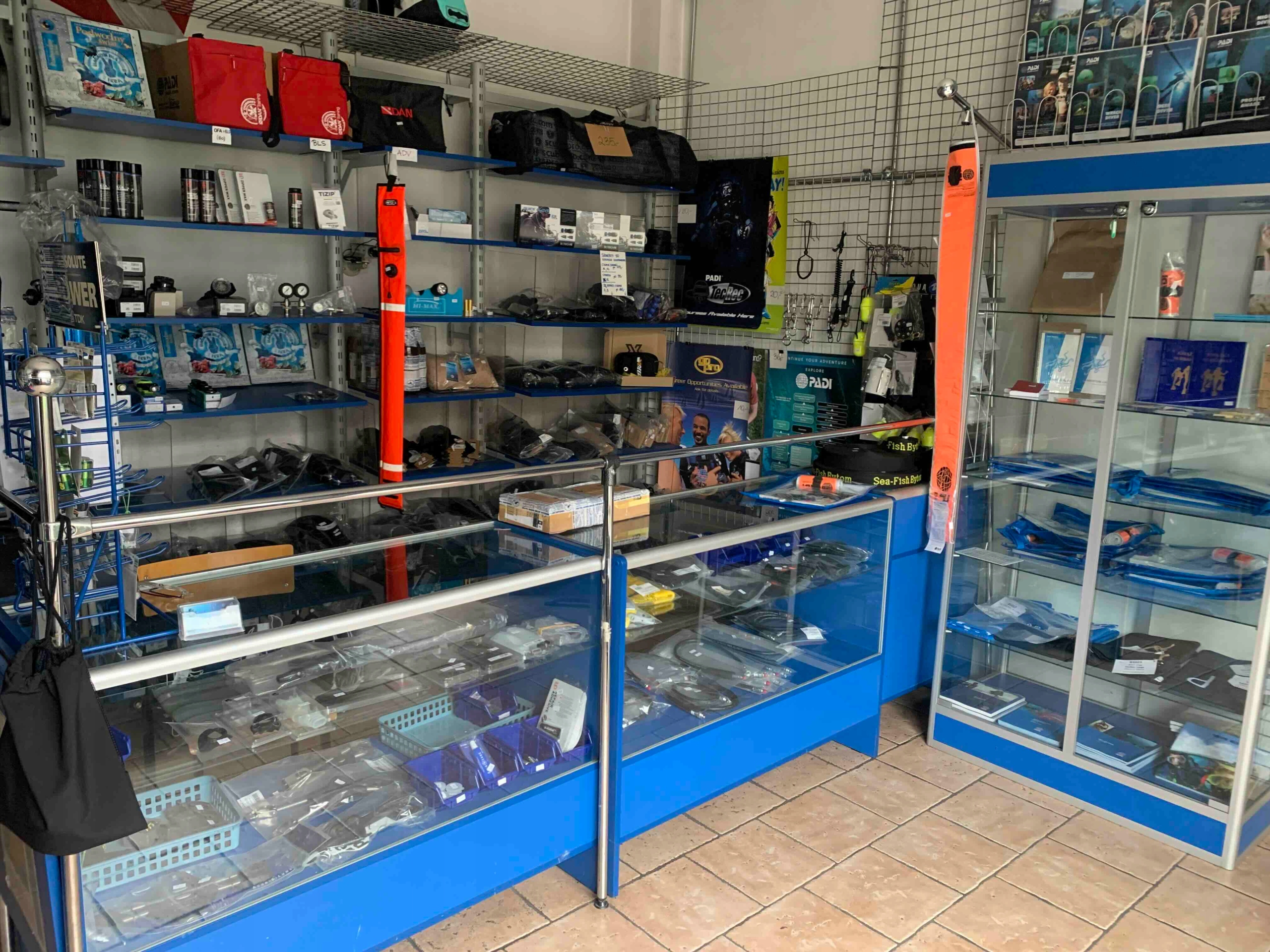 заряжает цилиндр воздухом, распространением материалов PADI и продажи оборудования Dan Diving Equipment.