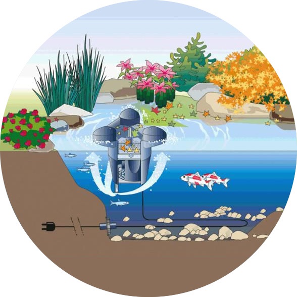 Скиммер собирает листья, частицы пыли, оседающие на поверхности воды, остатки пищи и другие загрязнения, а также излишки белка (пена – накапливается в результате биологического дисбаланса). Он улучшает прозрачность пруда, поддерживает воду в постоянном движении, а отсасывание нагретой поверхностной воды позволяет поддерживать постоянную температуру в пруду, что снижает рост водорослей. Повышает оксигенацию резервуара и улучшает газообмен.