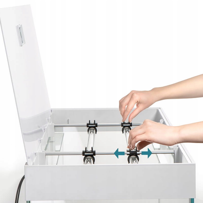 чуть ниже обложки, внутри танка есть два рельса со светодиодным освещением Акваэля Ледди Туби Санни День и Ночи 2.0, с 17 Вт . Рельсы позволяют вам удобно изменить место модулей освещения, поэтому вы можете равномерно осветить весь аквариум или только выбранную часть. Максимальное количество модулей освещения, которые можно установить в наборе OPTI, составляет 9.