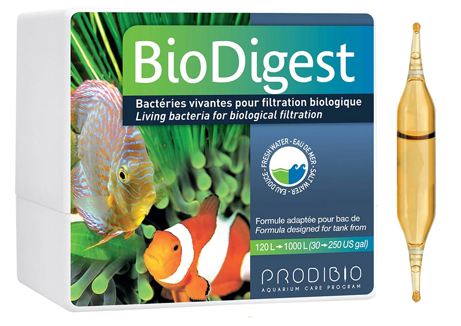 Biodigest устанавливает биологическую фильтрацию и очищает аквариум путем естественной нейтрализации органических отходов с помощью 9 штаммов гетеротрофных бактерий: Paracoccus denitrificans и Pseudomonas stuzerii.
