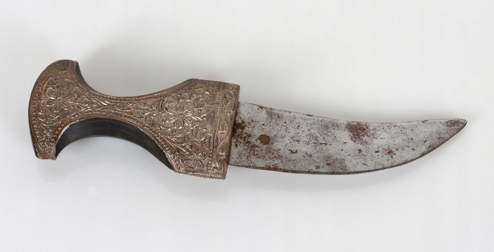 Нож - лезвие стальное, деревянная рукоять, облицованная с обеих сторон посеребренным листом с цветочным мотивом.